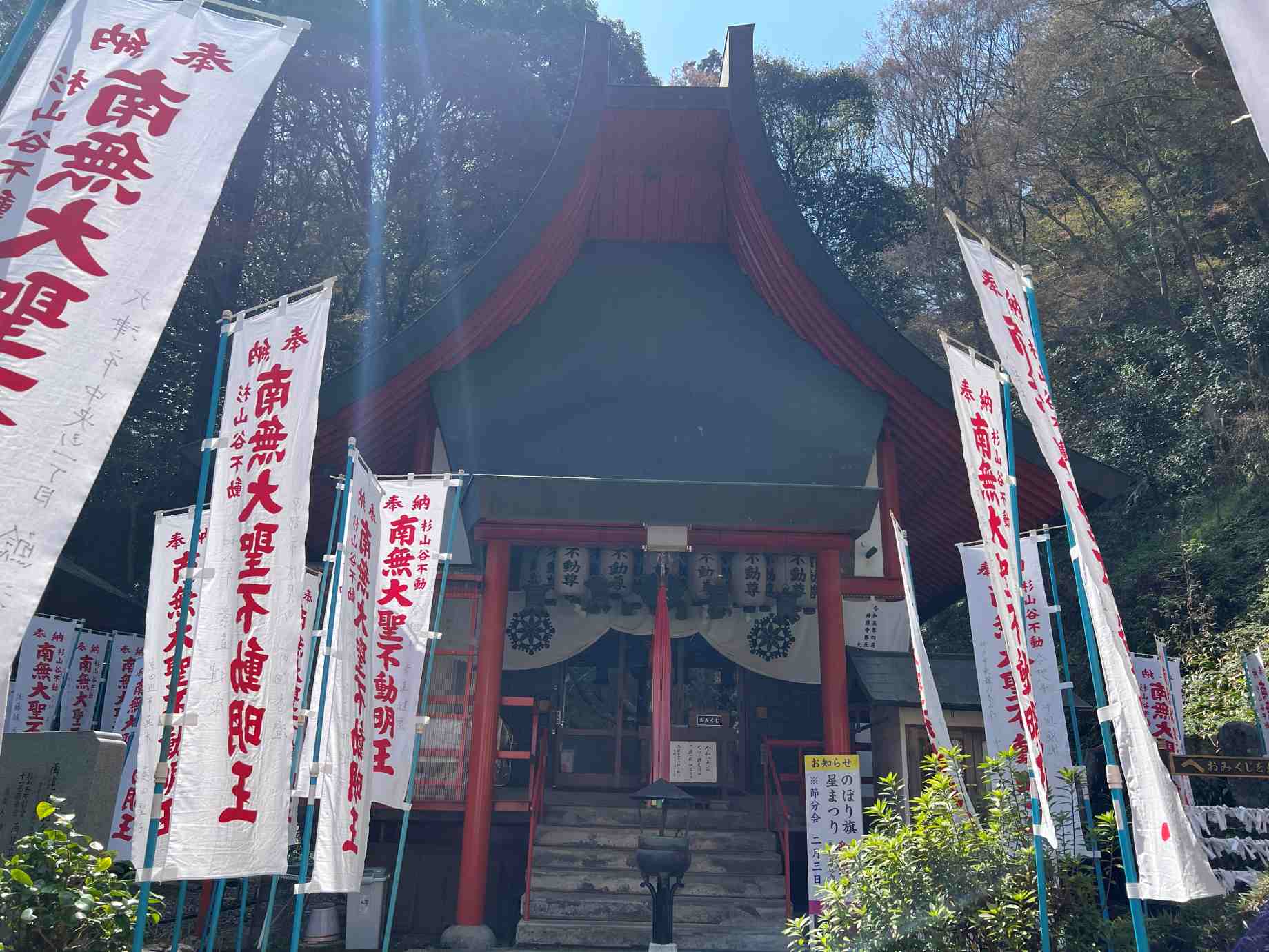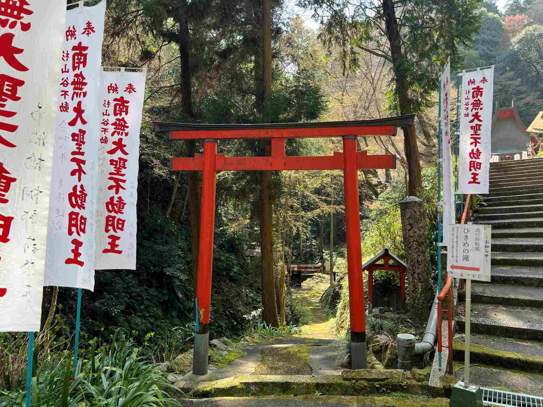 階段を降りると鳥居と南無大聖不動明王の幟が立ったていた。 |