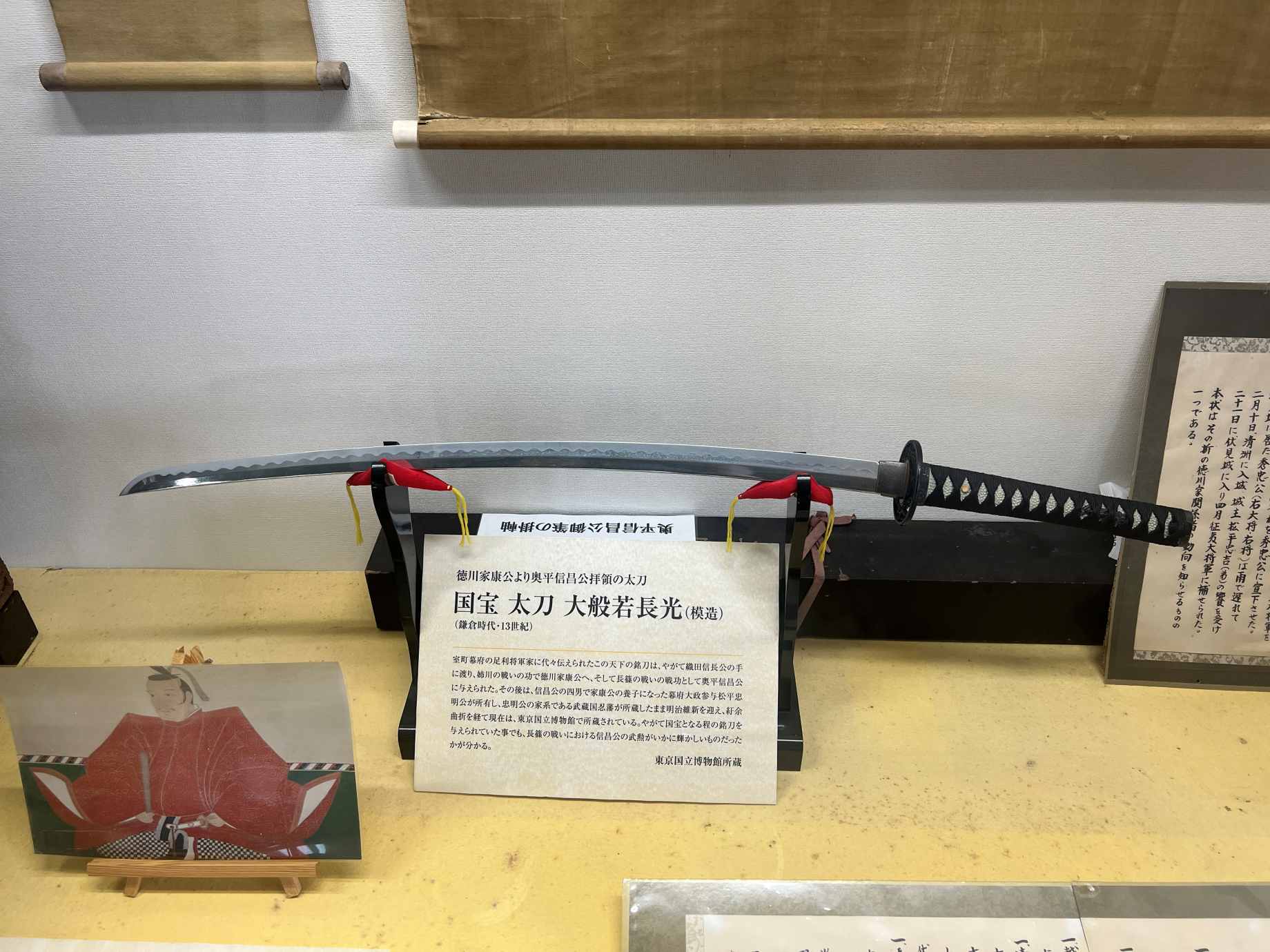 長篠の戦いで功績があった奥平信昌に家康から与えられ、奥平家分家の松平奥平家(忍藩)へと伝わりました。現在は国宝指定され東京国立博物館が所蔵しています。 尚、太刀は刃を下向きに展示するのが一般的なので展示方法が間違っていますね。もしかすると高低差のある丁子乱の波紋を見せたかったのかな。 |