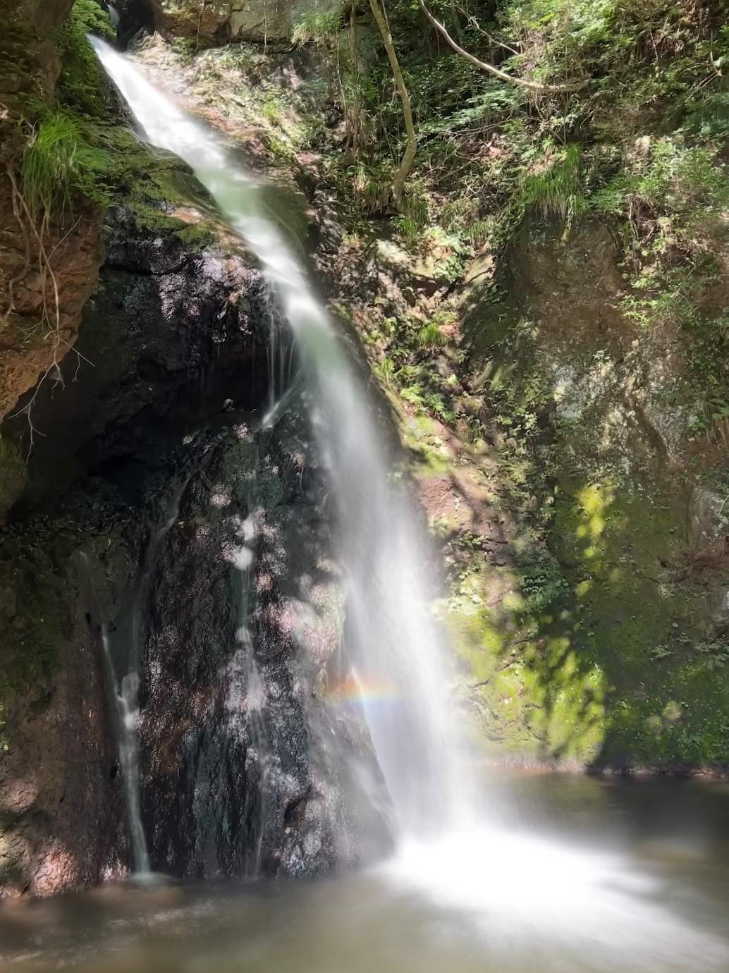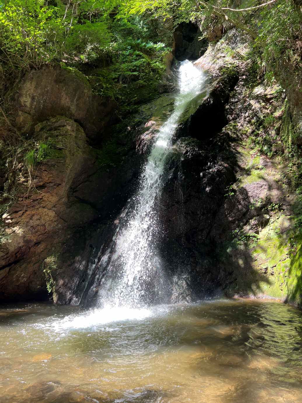 滝前はぽっかりと空いた空間になっており、緑の木々の間に一筋の滝が見えました。壁面の真ん中辺りに斜めに割れた断層が走り、滝の流れに変化を与えています。滝の映像 |