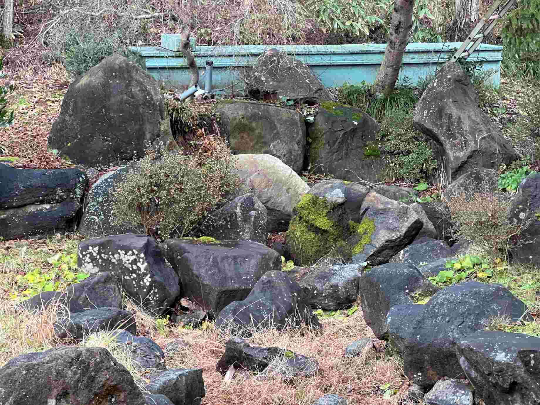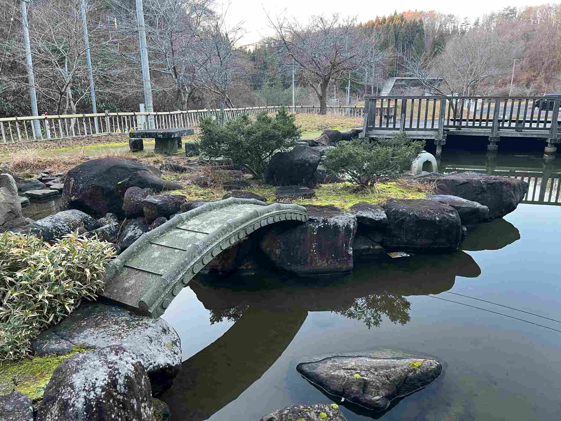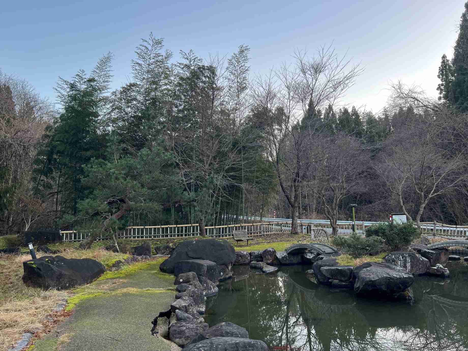 再び道の駅の方にお聞きしたところ、池の中の石は滝石組の一部で、かつては後ろのタンクに貯めた水が流れ落ちていたという。自然の力には抗えないとはいえ、静まり返った池に崩れた石が横たわる光景は、どこか物悲しさを感じる。 滝の映像 |