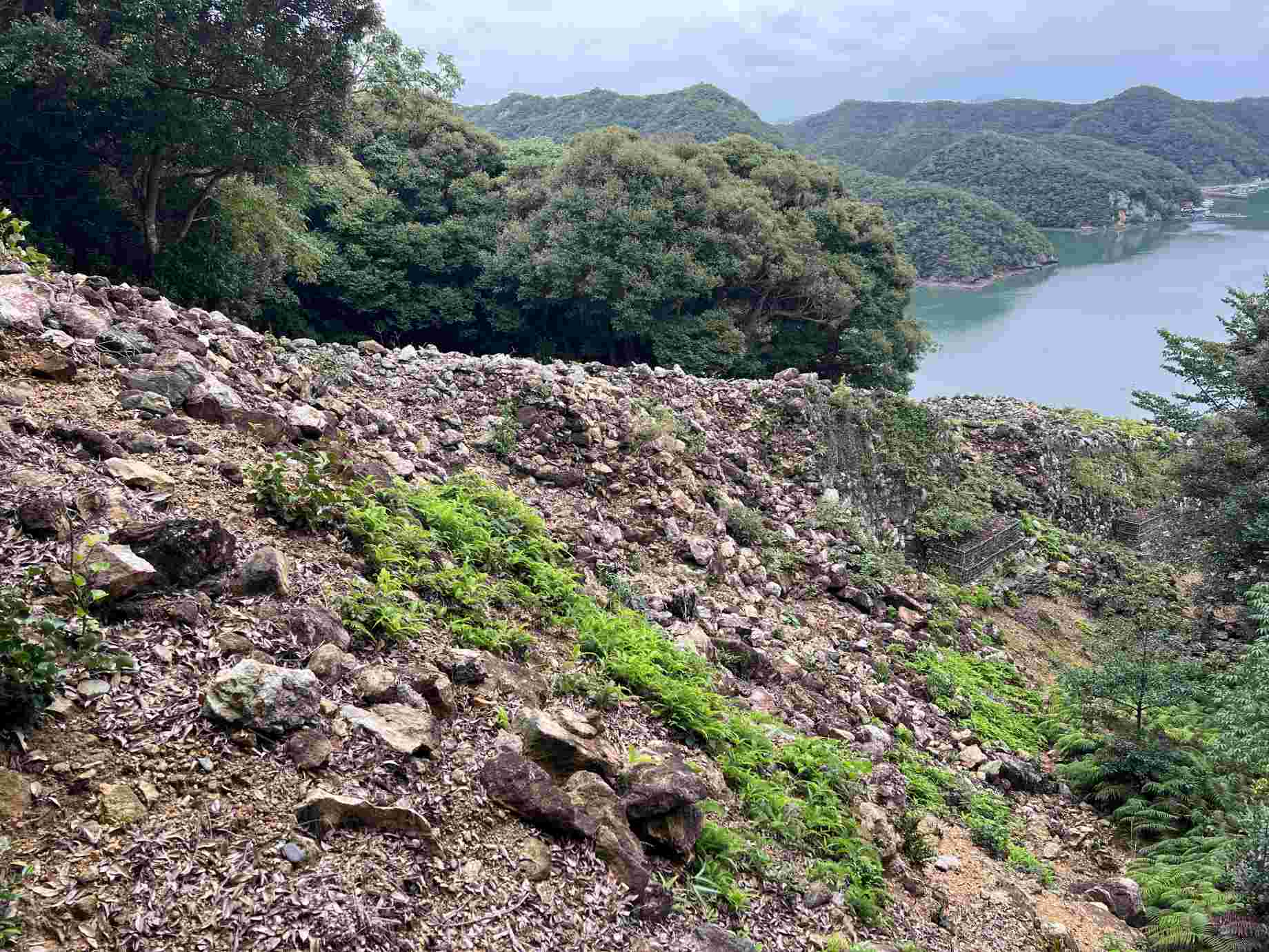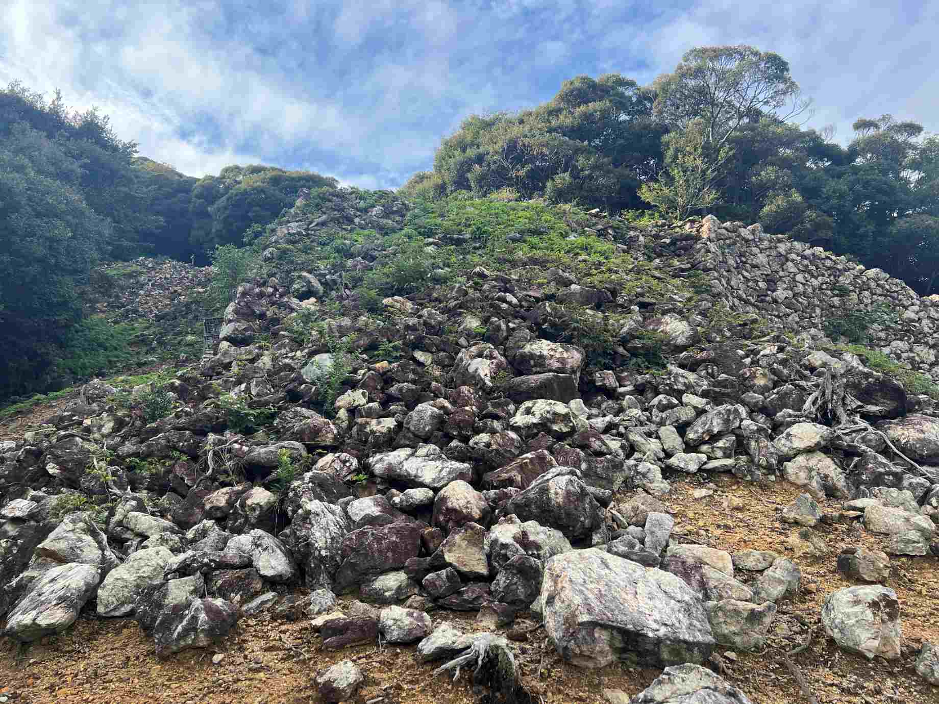 東南角石塁に出ました。石塁は2.8キロにも渡って一周する壮大なものです。 |