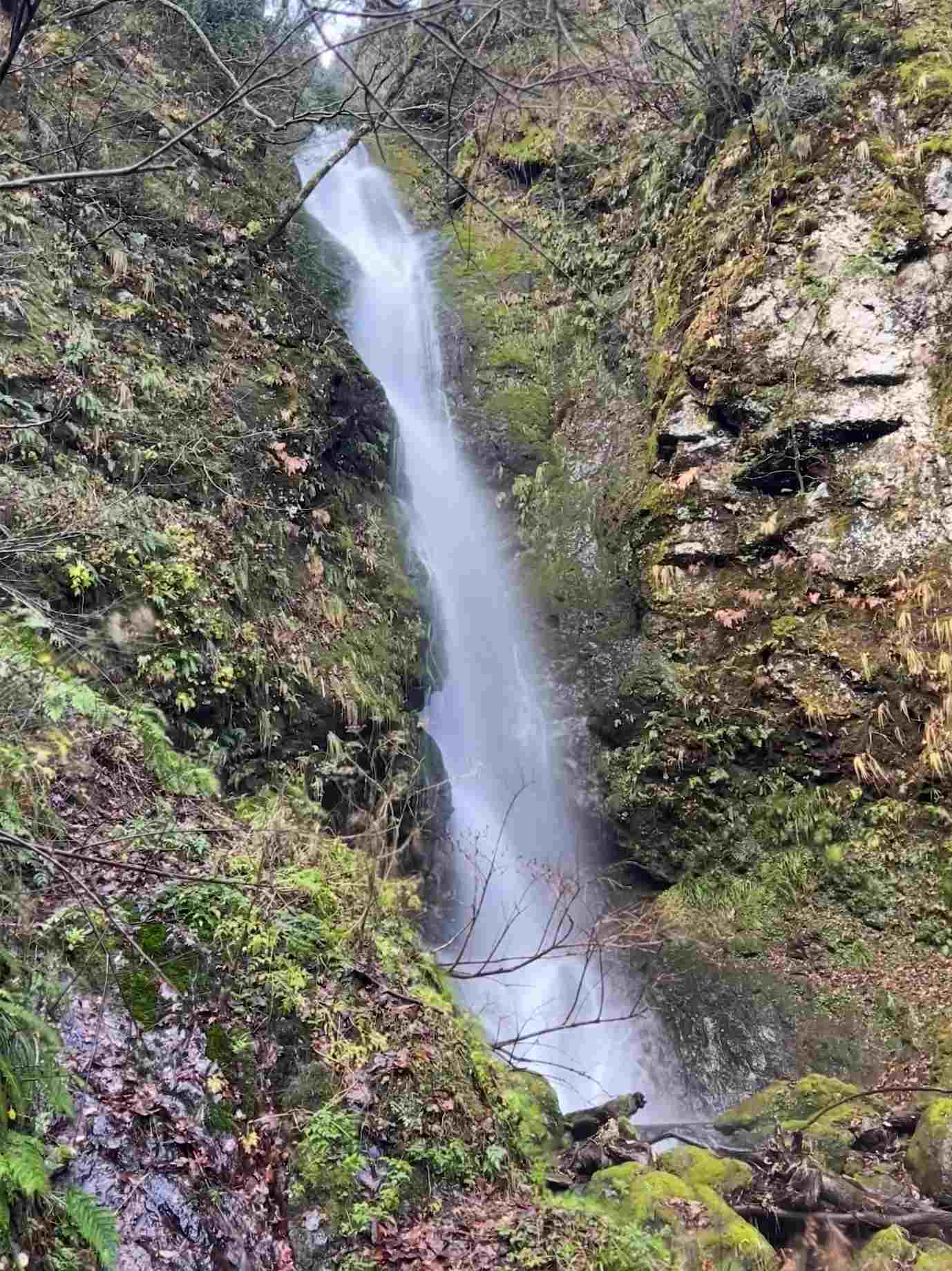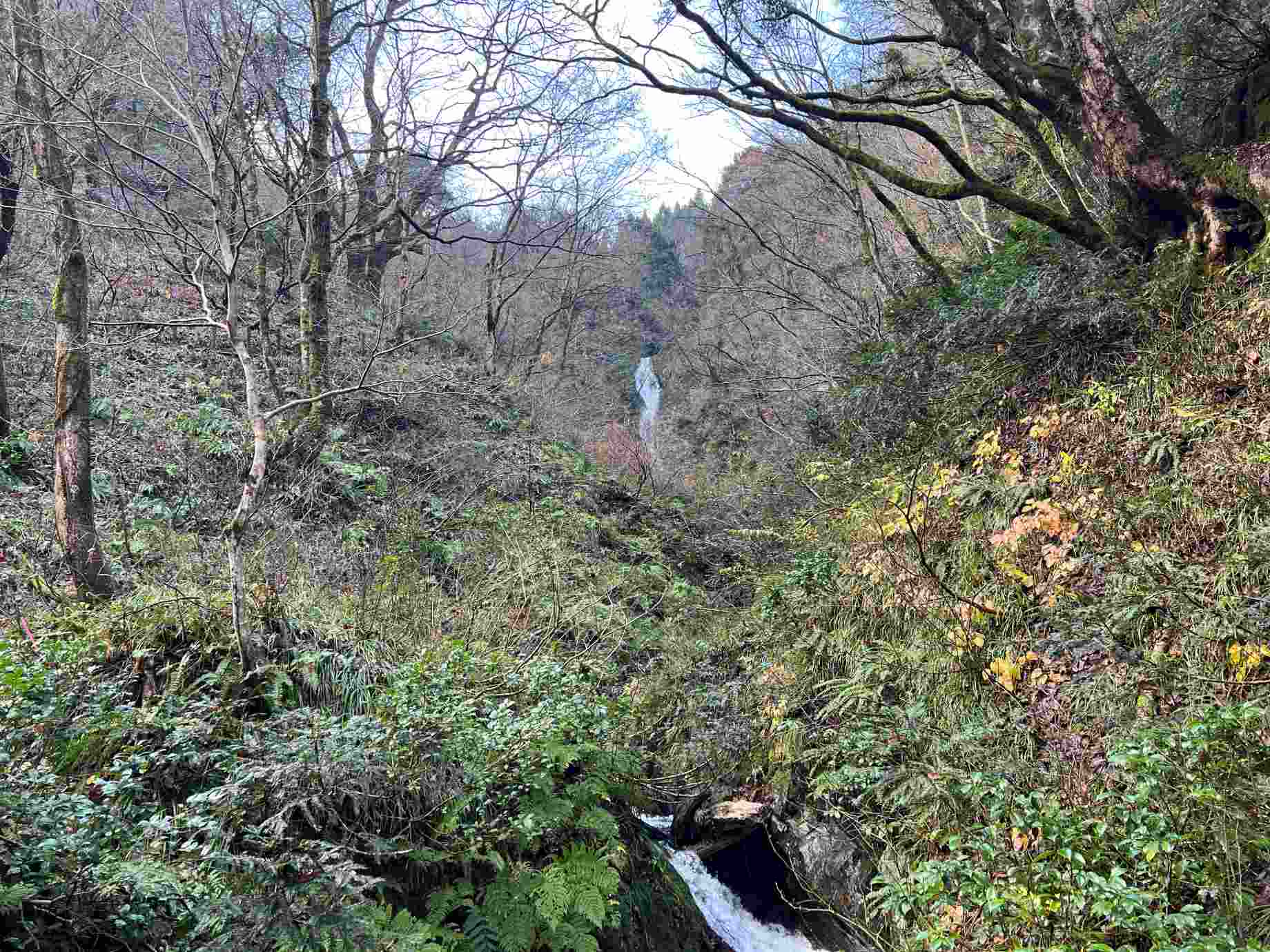 遊歩道を進むこと5分ほどでその全貌が見えてくる。かなりの高さを誇る滝で、上部は手前の岩に半ば隠され、どこか早戸大滝を思わせる景観だ。ここでもまた、長い年月が岩を割り、削り、形を変えてきたのだろう。自然の営みの力強さには、いつも心を揺さぶられる。 滝の映像 |
