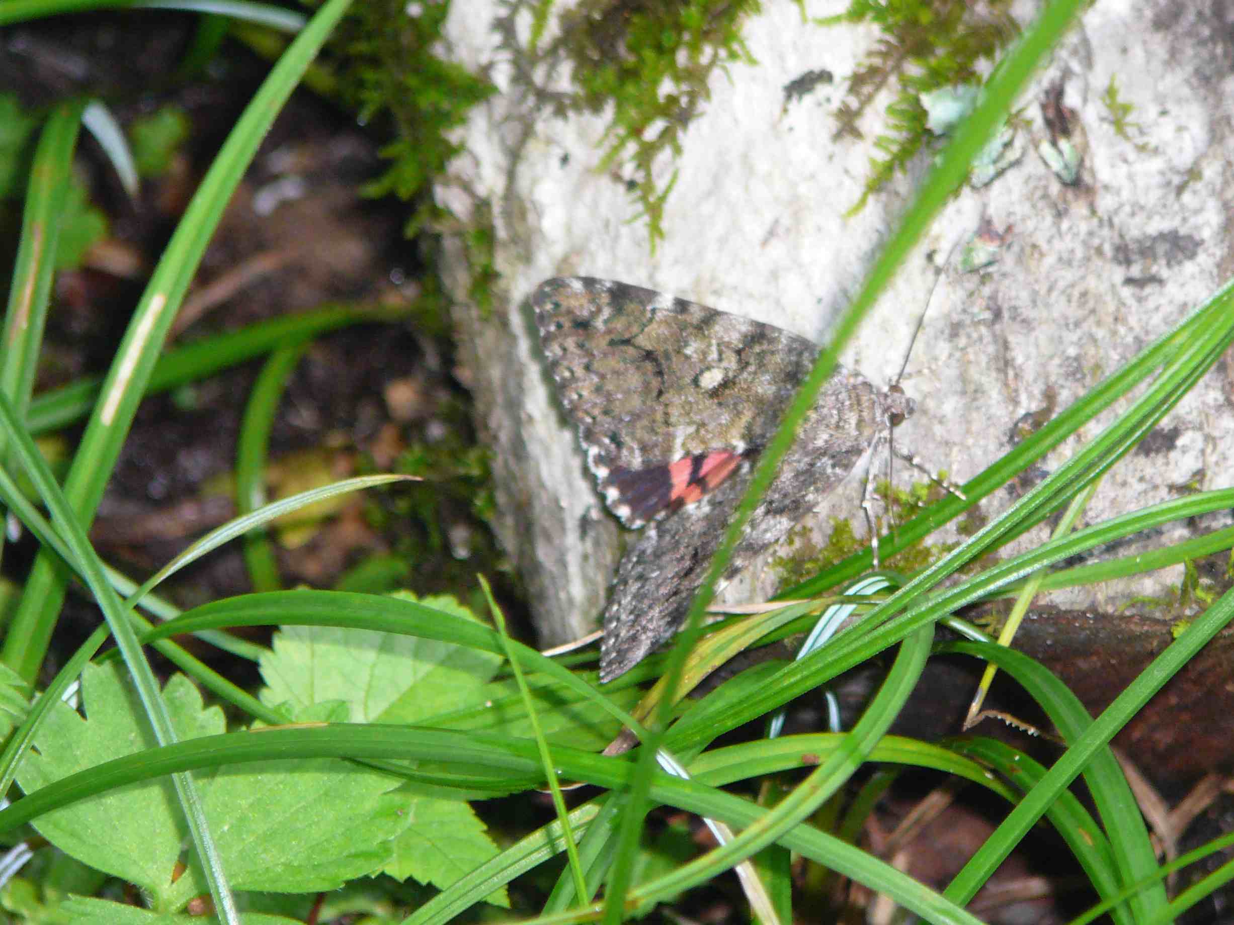滝つぼには蛾の一種「オニベニシタバ」が石の色に溶け込むように佇んでいた。 |