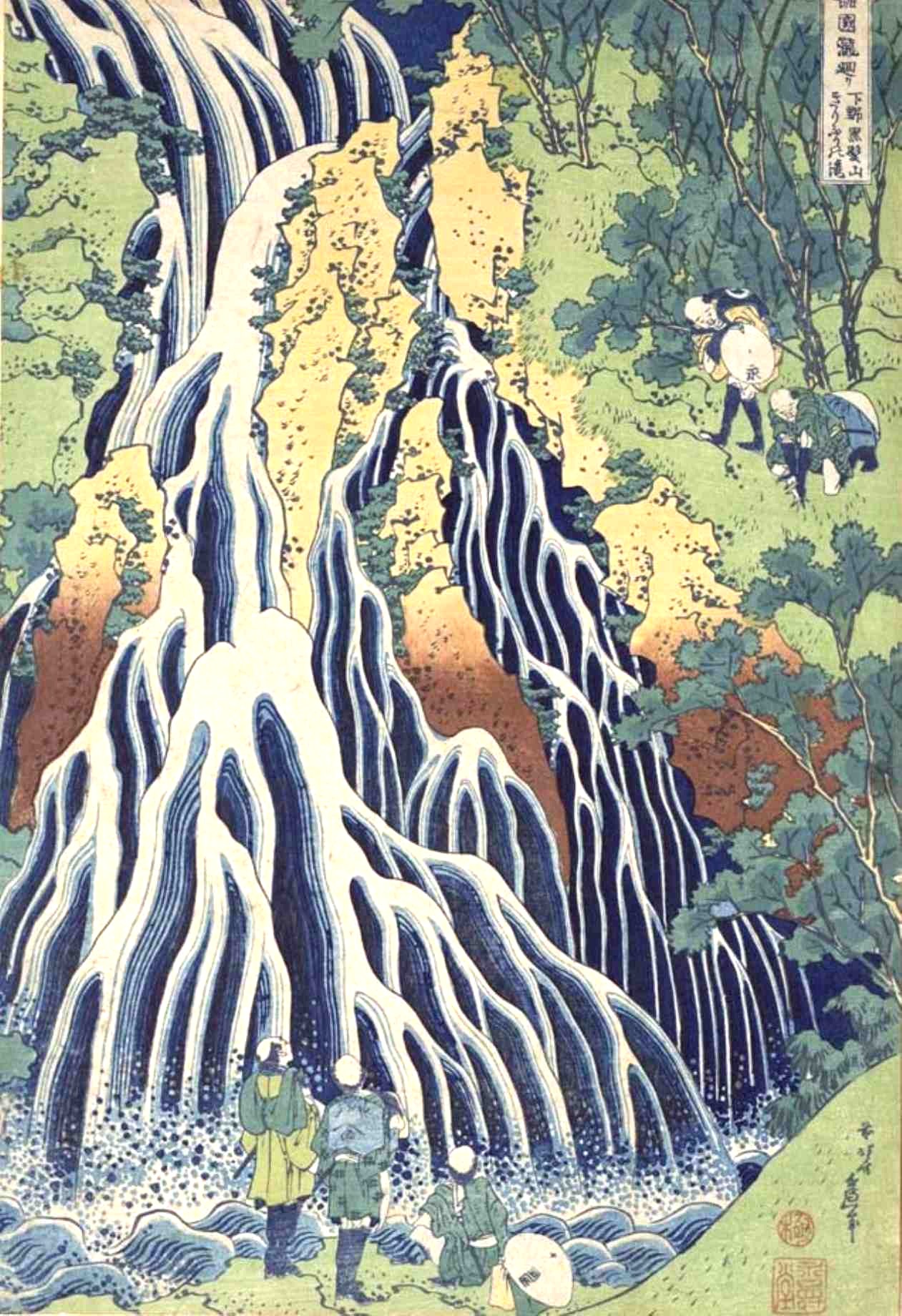 こちらが葛飾北斎が画いた「下野黒髪山きりふりの滝」だが、滝つぼから見たのとそっくりだ。滝つぼには旅人がおり、江戸時代は滝つぼから見上げるのが一般的だったのだろう。 出典:東京国立博物館 葛飾北斎「諸国滝廻・下野黒髪山きりふりの滝」(https://webarchives.tnm.jp/imgsearch/show/C0028353) |