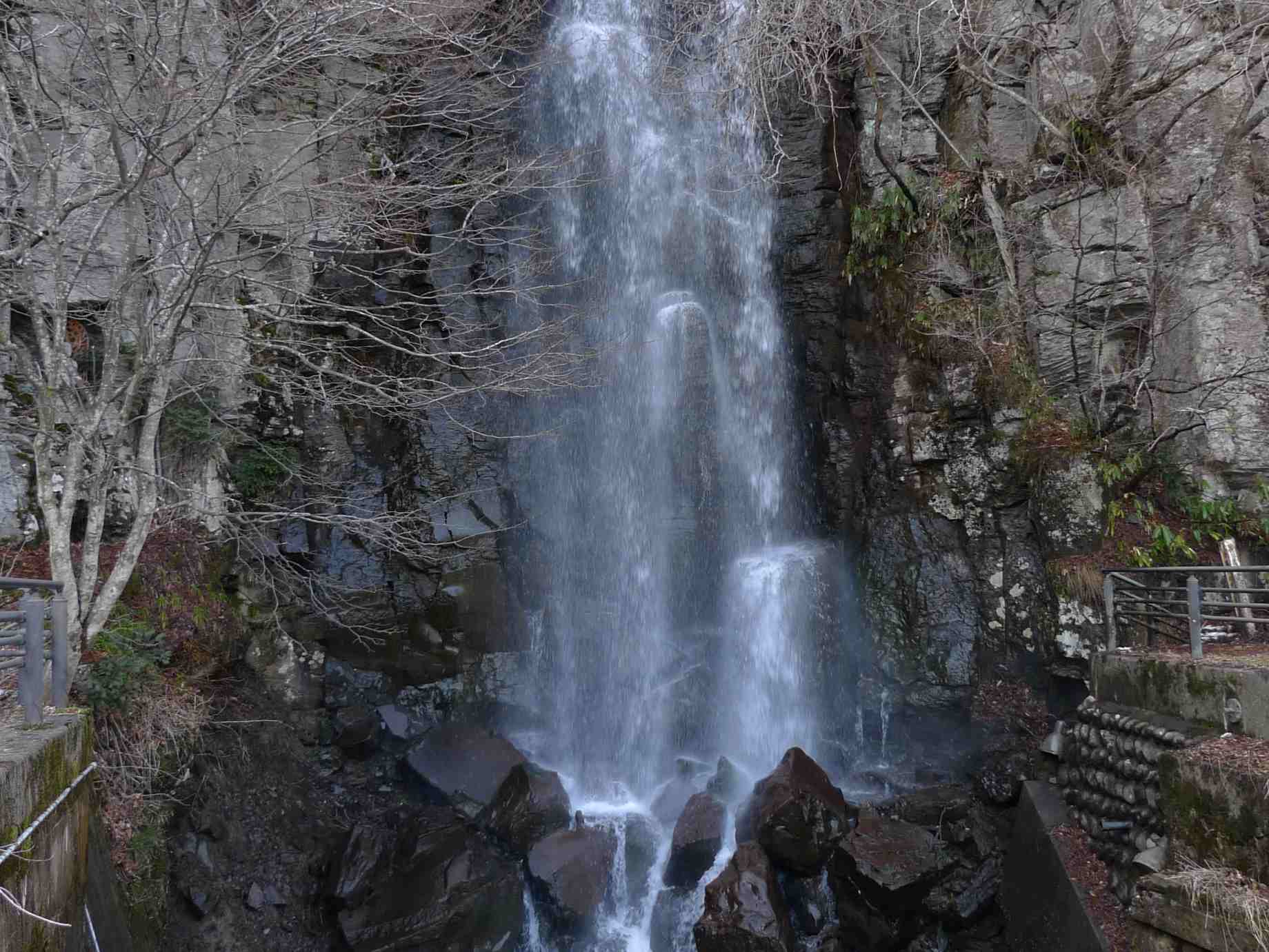 落葉した木々の間から滝がよく見える。 |