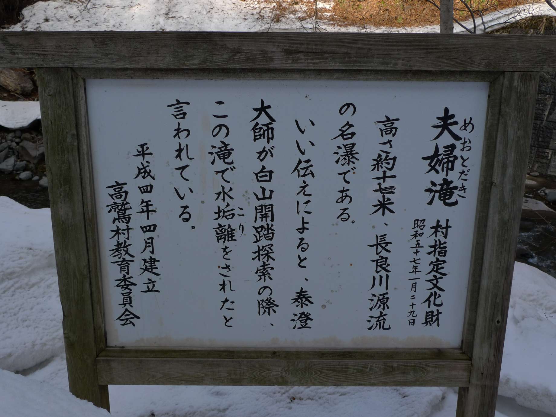 ヘアピンカーブのところにある夫婦滝の看板も下の方は雪に埋没している。 |