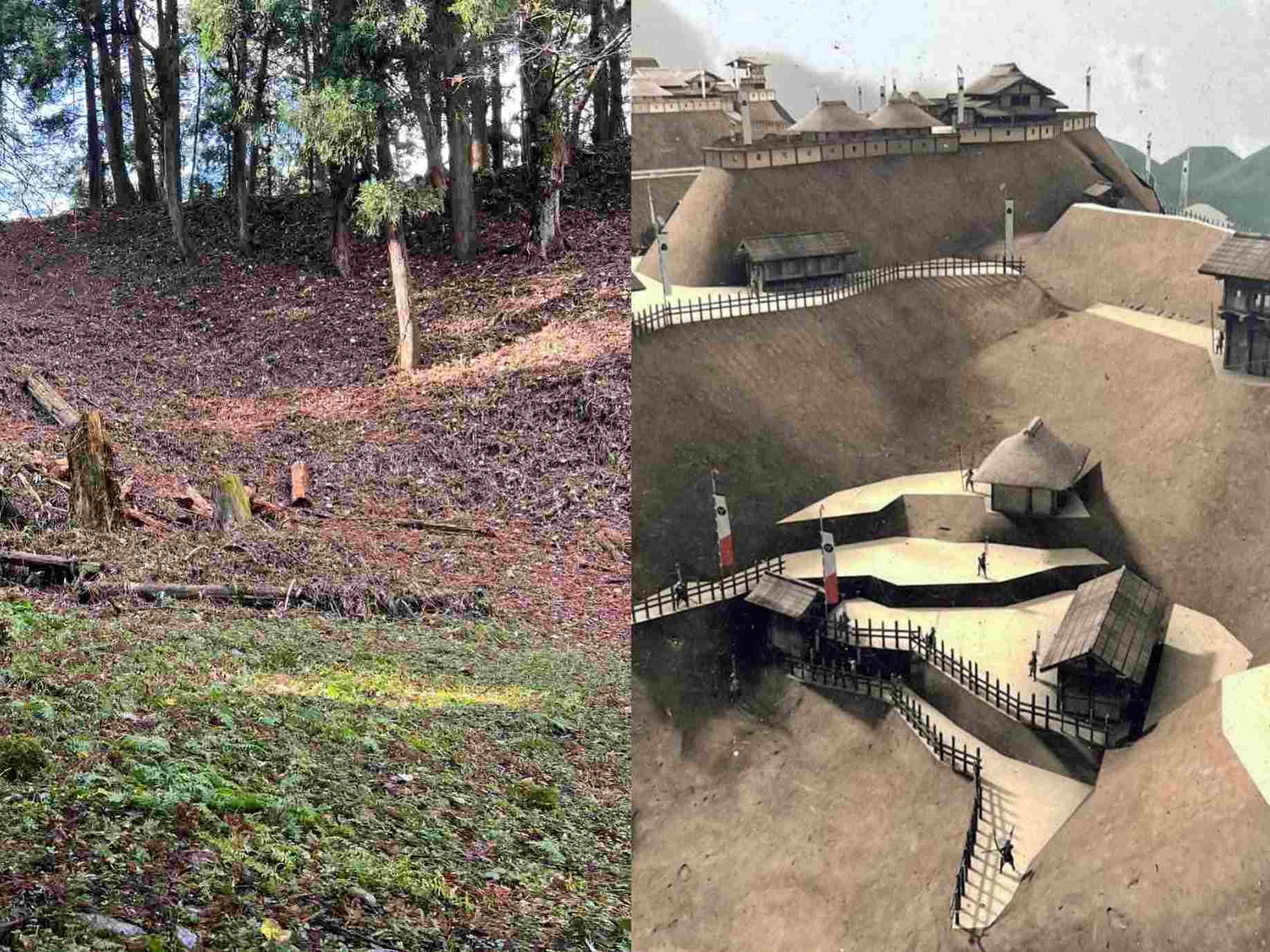 さらに進むと、馬之背ゴと呼ばれる細長い尾根に出る。冠木門と七曲り口の双方から迫る敵を最前線で食い止めるための防衛拠点で、その名のとおり馬の背中のように細く、L字形に曲がった地形が印象的だった。 |