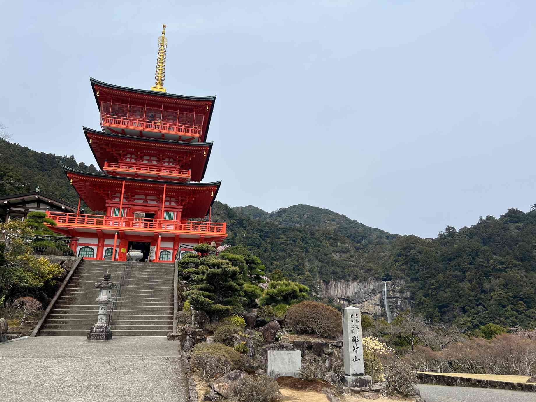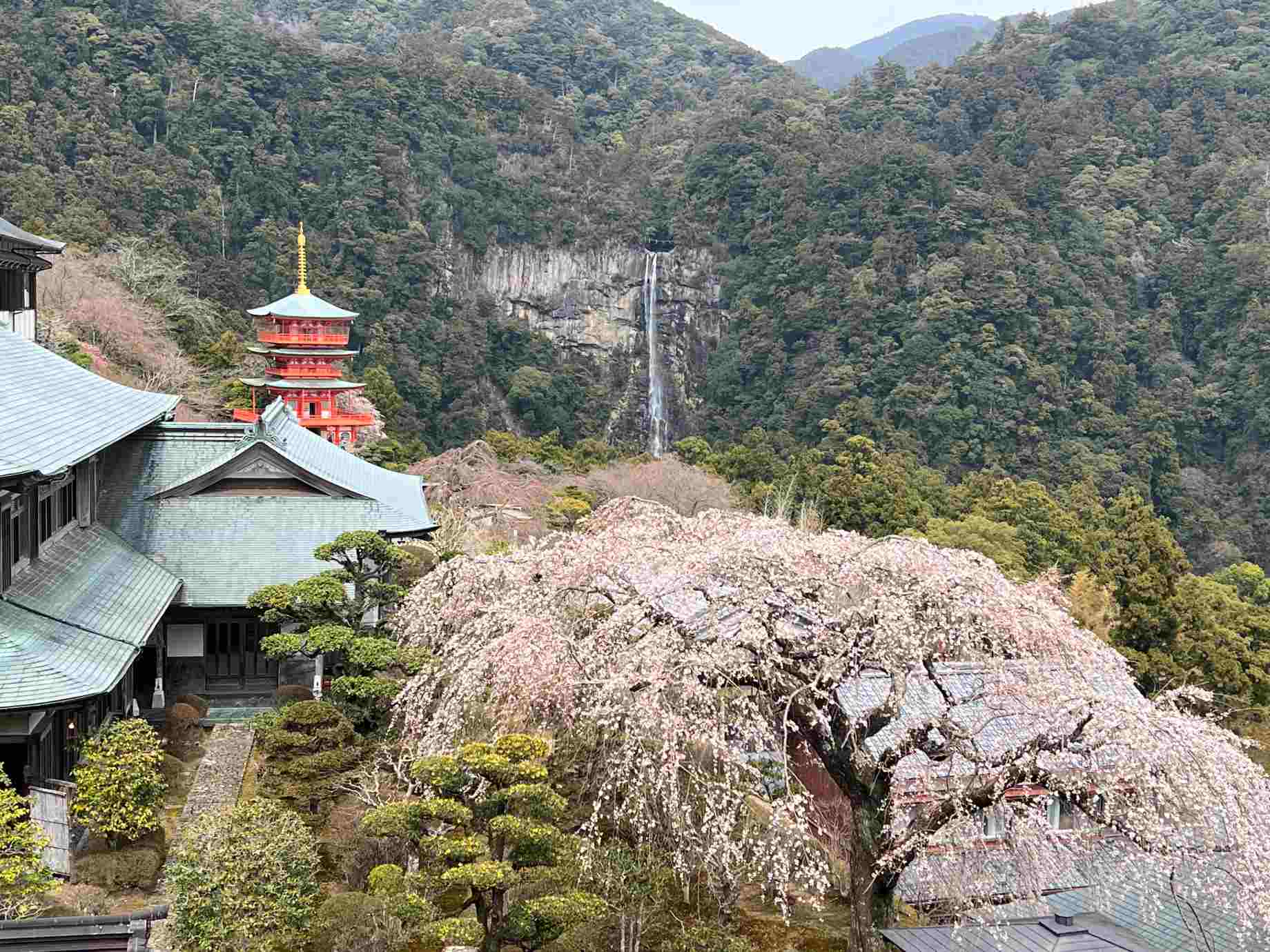 三重の塔と那智の滝が並ぶ光景は、どう見ても絵になる。 |