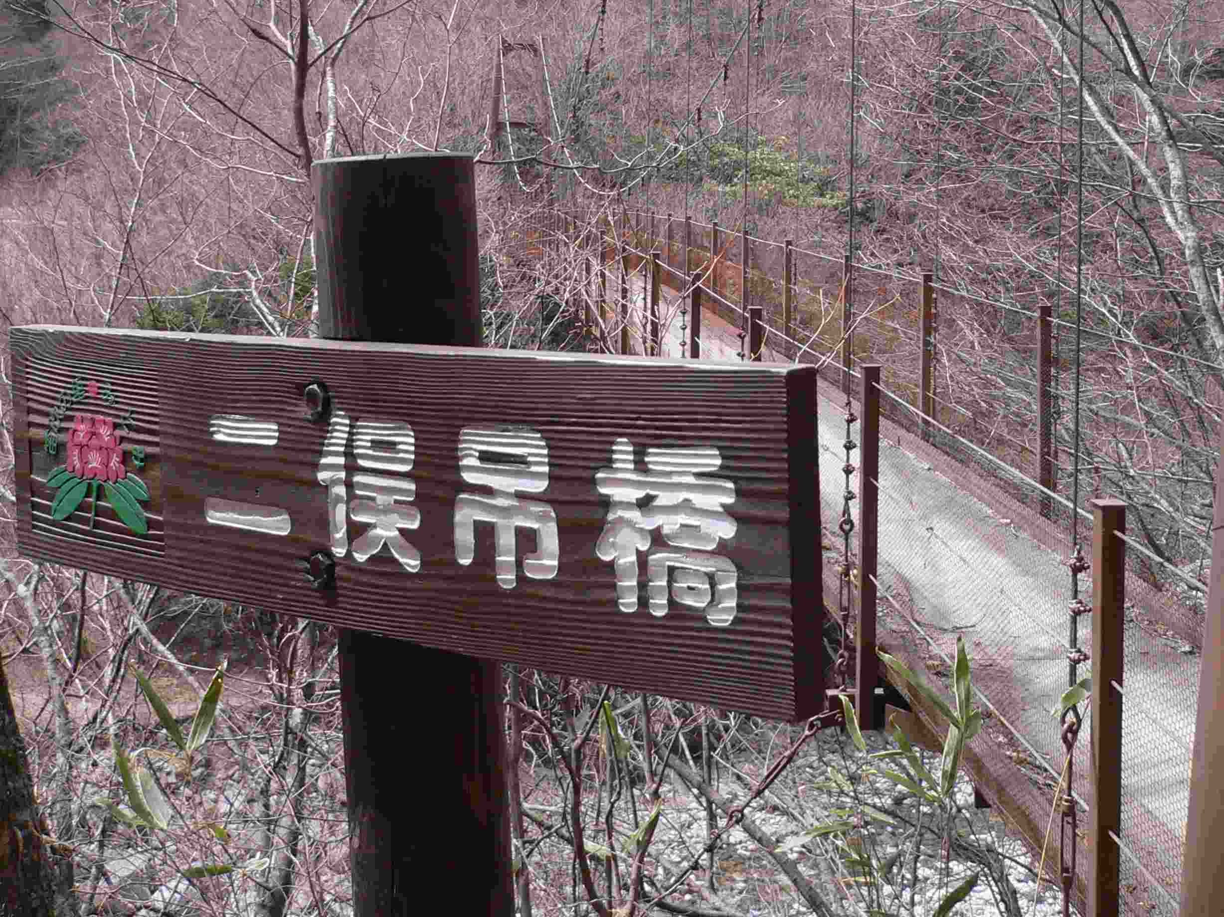 東沢にかかる二股吊橋を渡ると西沢渓谷入口だ。 |