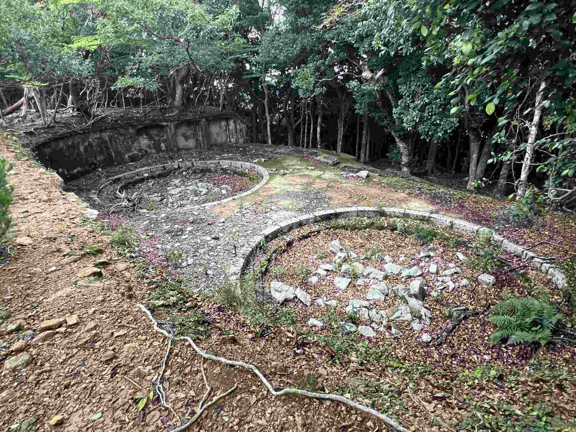 砲台跡に戻り今度は上から見ましたが、砲台は丸い形をしているんですね。360度動くのかな・・・。 |