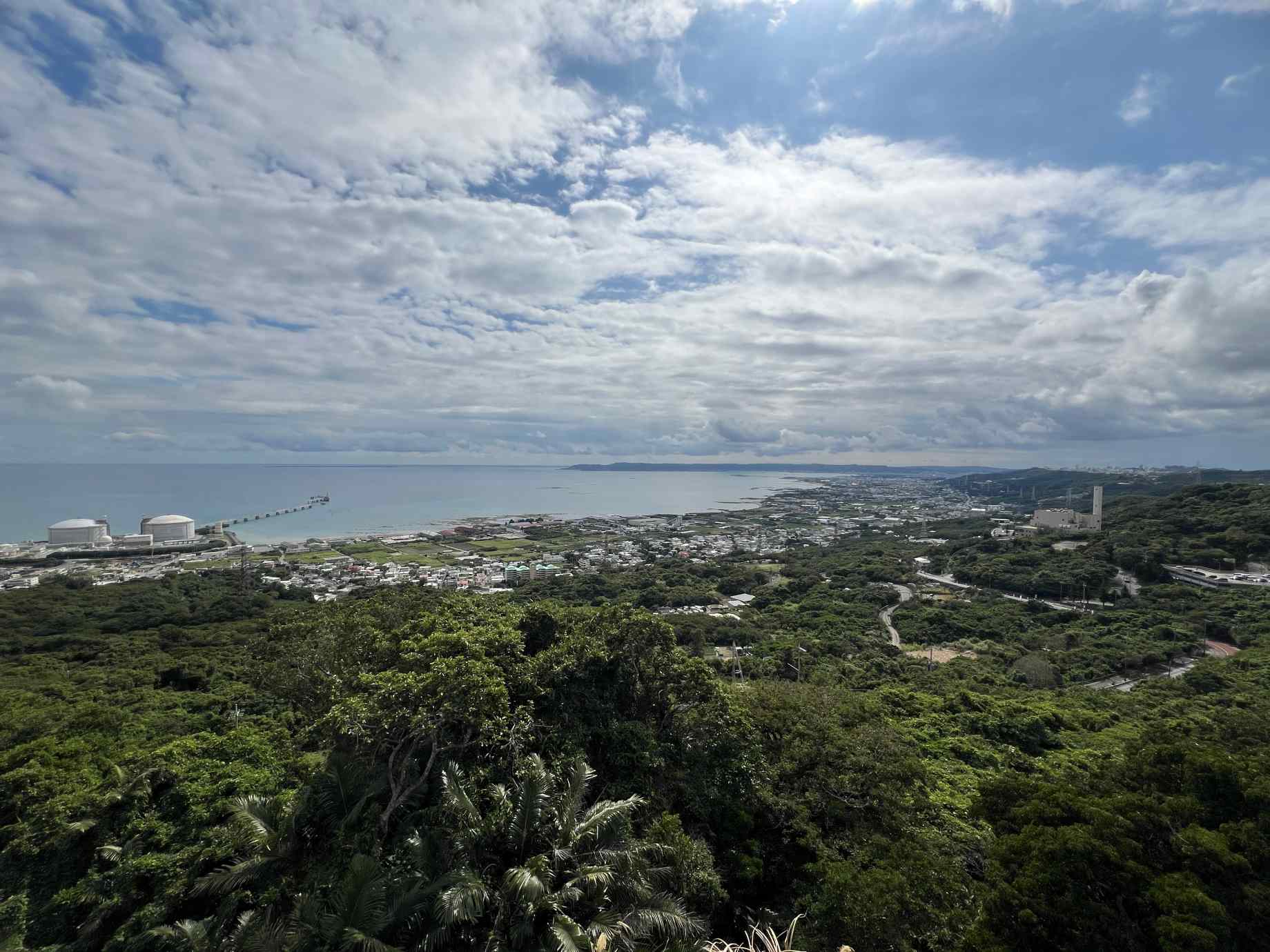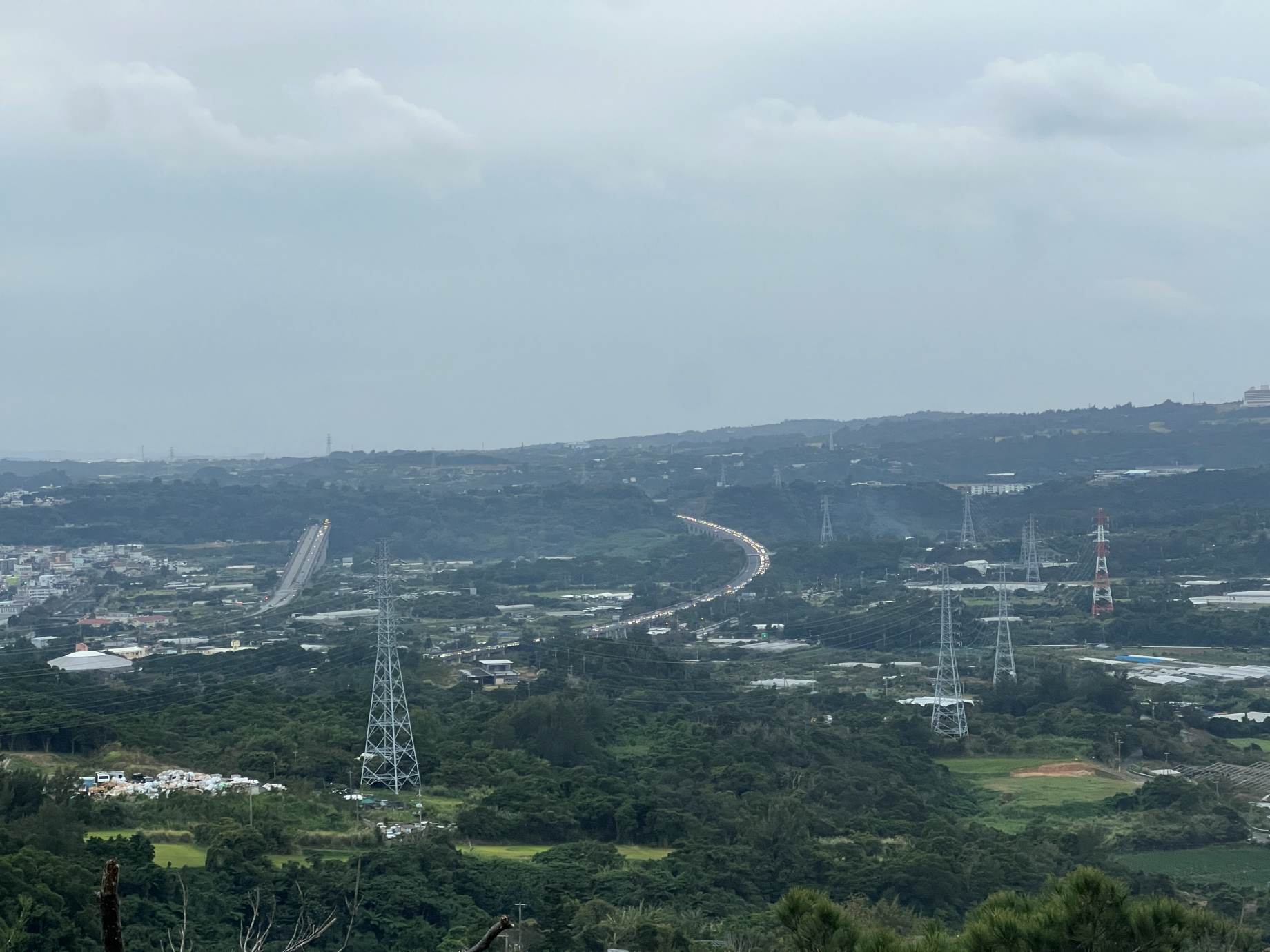 展望台からは朝の通勤渋滞だろうか、沖縄自動車道上で停まるライトの列が見えた。 |