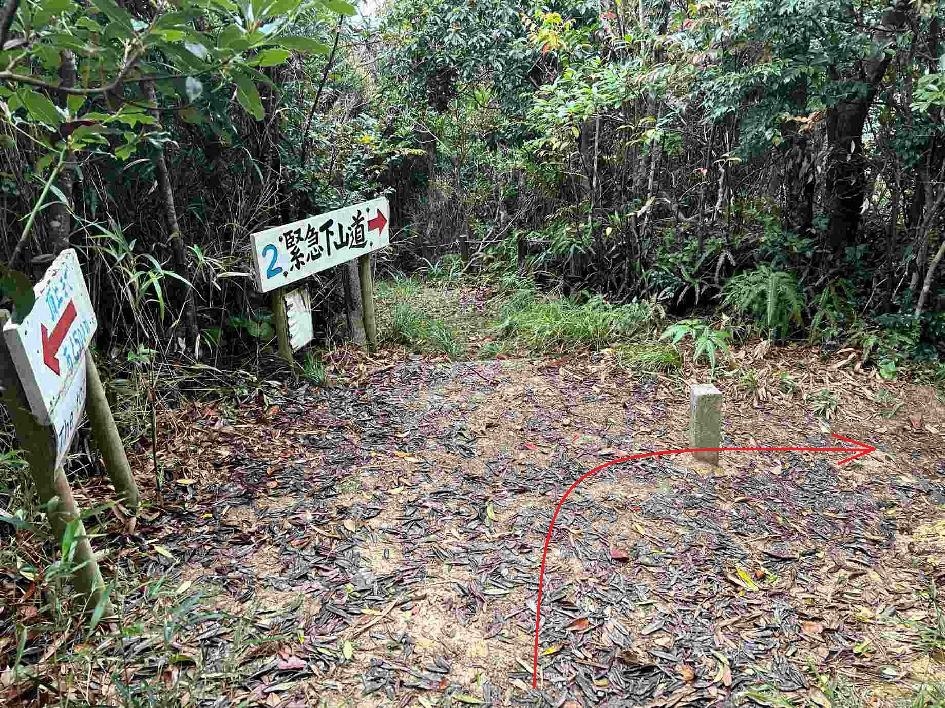 しばらく峠道を歩いていると緊急下山道に変わるので、ここを右へ曲がって、急坂を降りて行く。 |