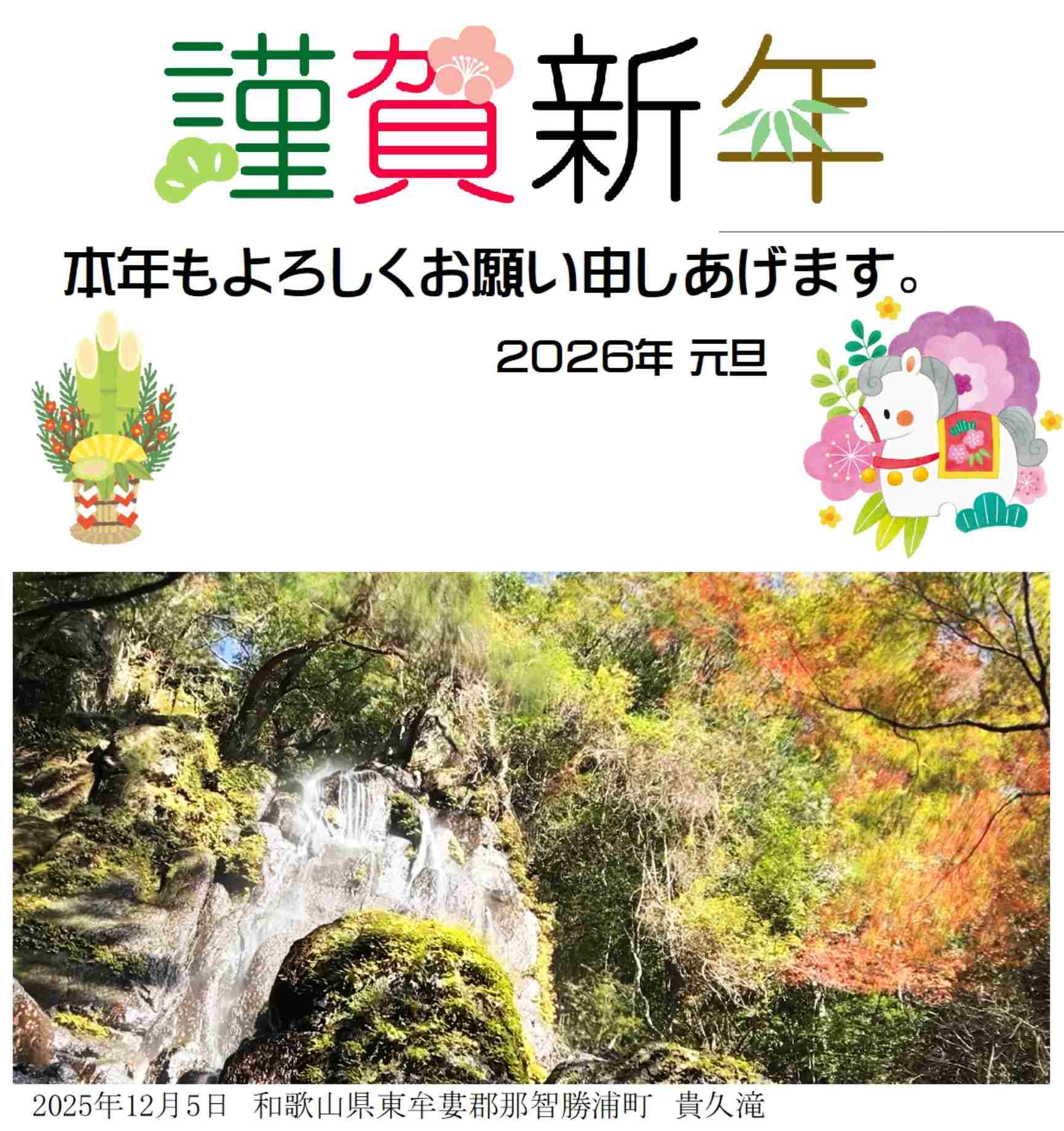 紅葉と素晴らしい滝に感動し、2026年の年賀状の図柄は貴久滝にすることに。 |