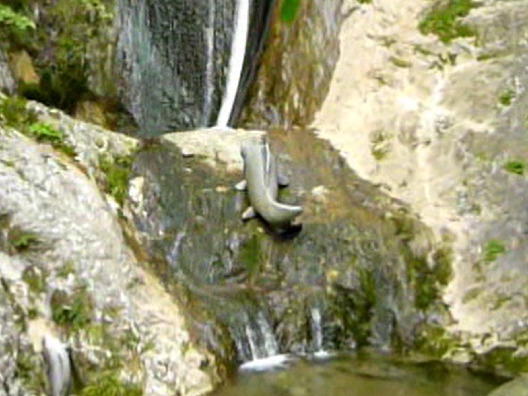 滝つぼには滝登りしている鯉の石碑がおいてあり、自然景観としては、大変残念です。でも、滝右側には不動明王が祀られており古くから信仰滝として不動の滝とも呼ばれていました。 |