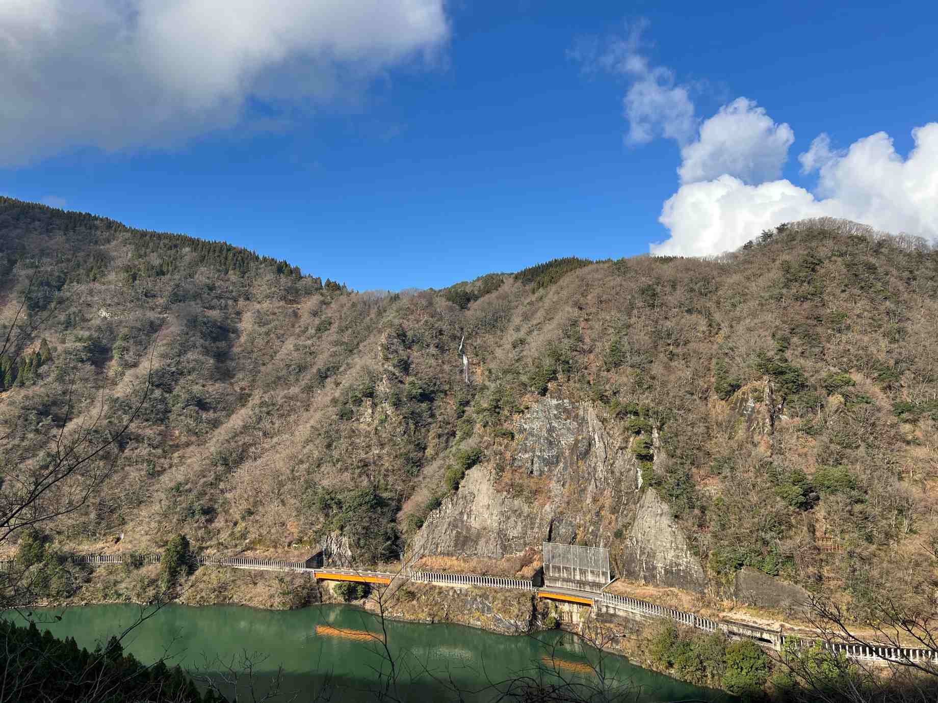 ダムの堤を渡ると簡素な城門があり、ここから山道が始まる。 |