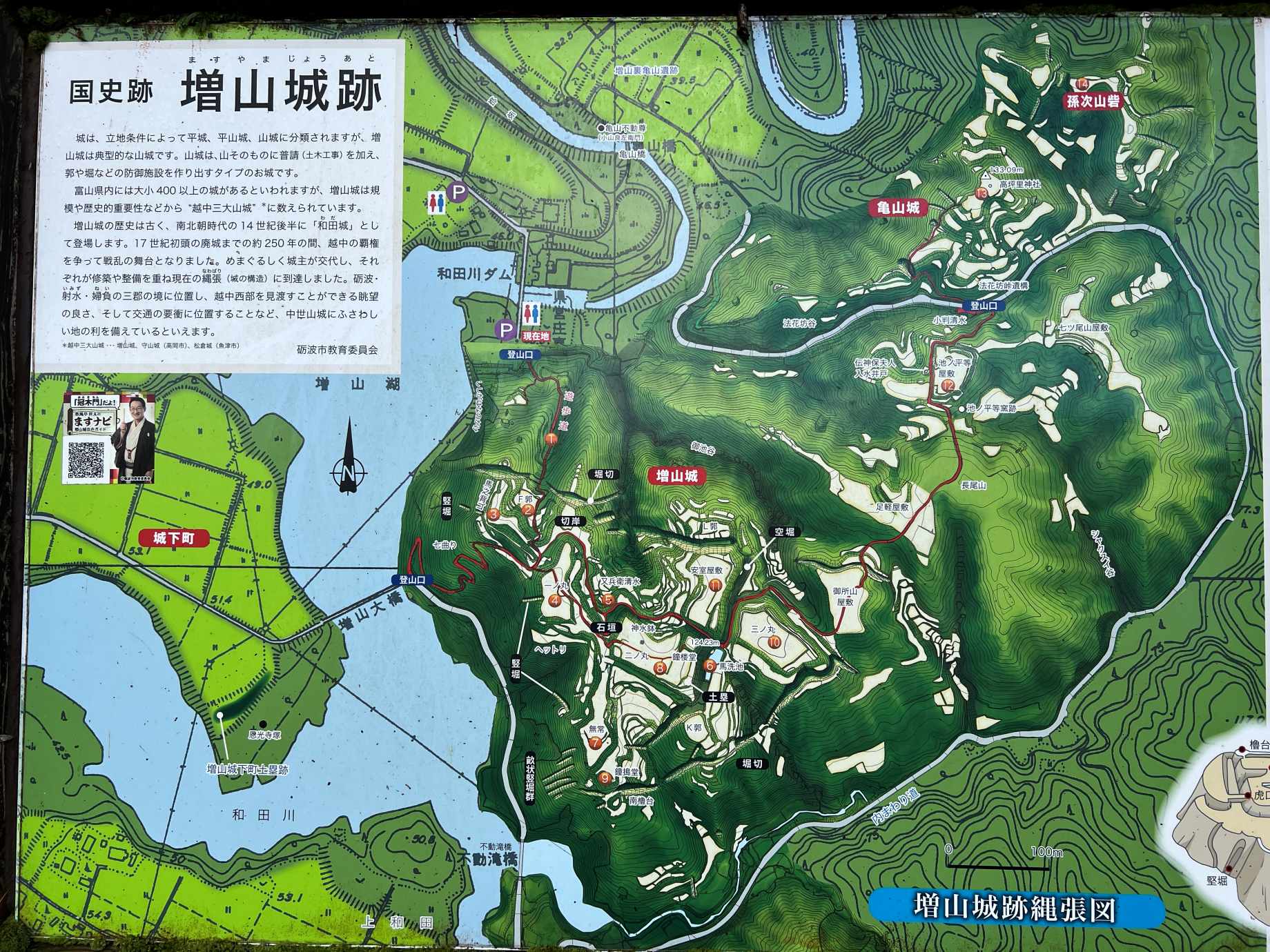 増山城の歴史は古く、南北朝時代の14世紀後半、和田城として史料に姿を現す。その後、神保氏、上杉氏、佐々氏と城主がめまぐるしく入れ替わり、最終的には前田氏の治下で一国一城令により廃城となった。 |