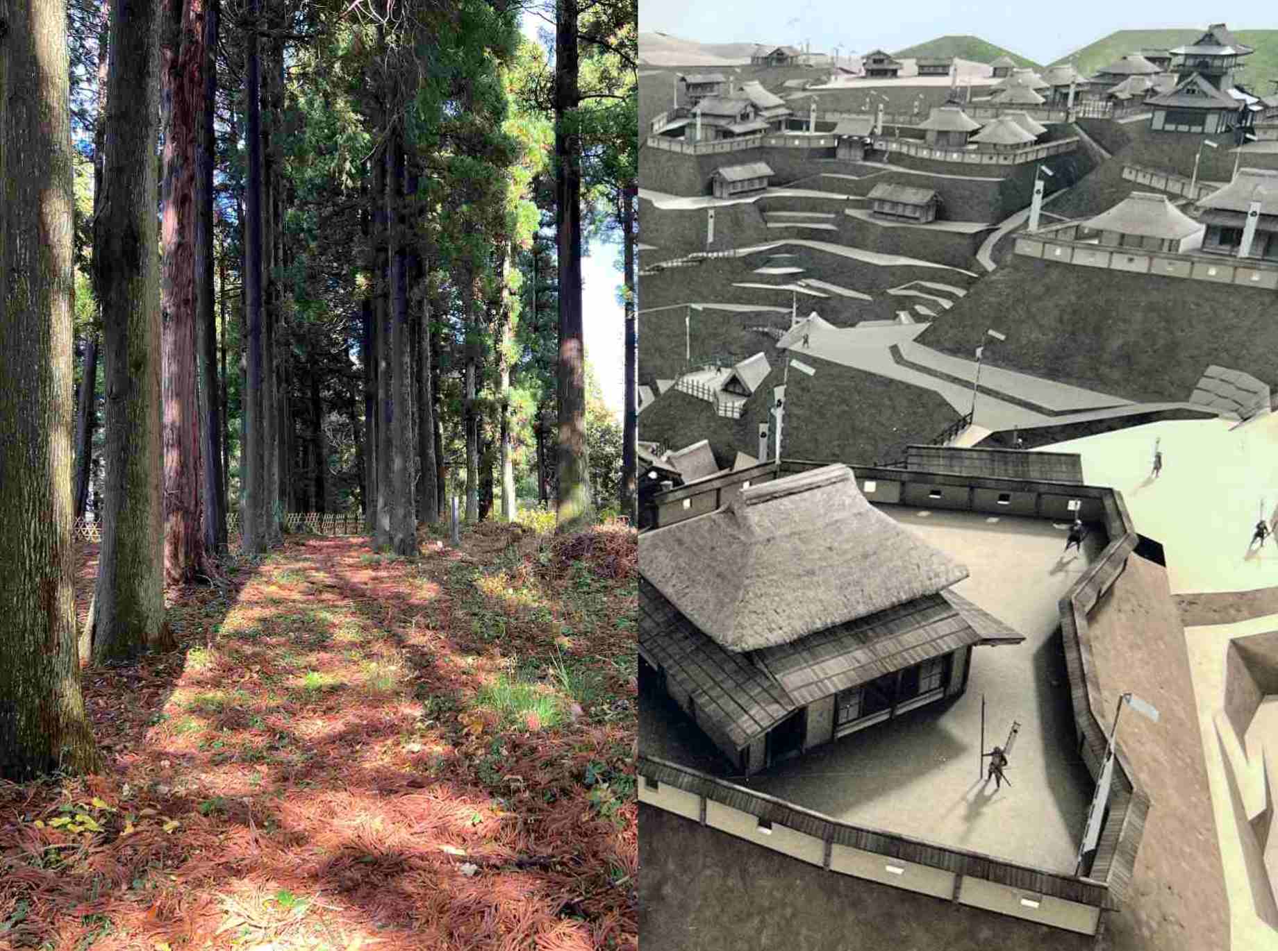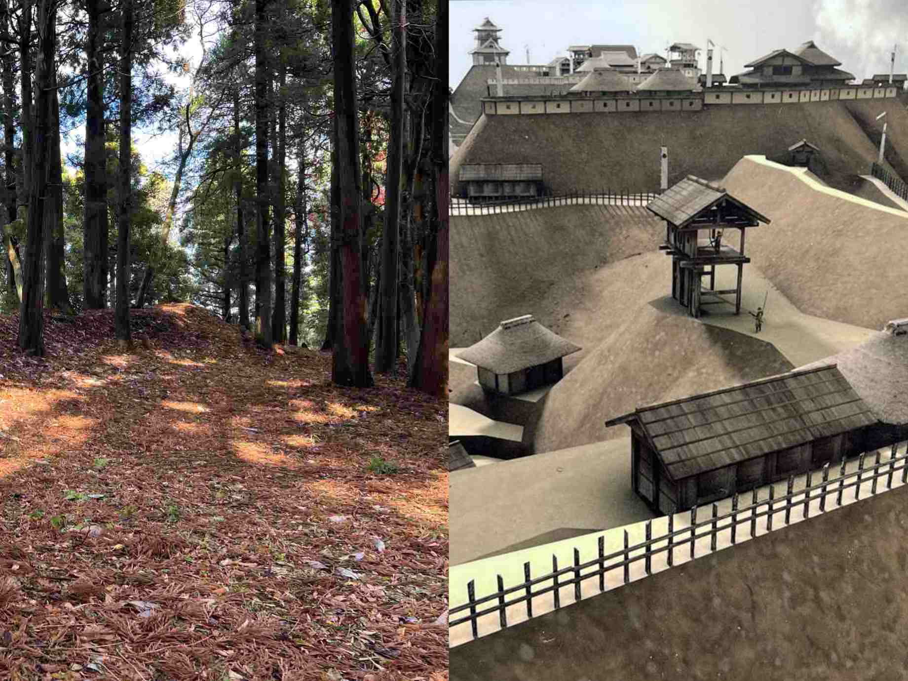 さらに進むと、馬之背ゴと呼ばれる細長い尾根に出る。冠木門と七曲り口の双方から迫る敵を最前線で食い止めるための防衛拠点で、その名のとおり馬の背中のように細く、L字形に曲がった地形が印象的だった。 |