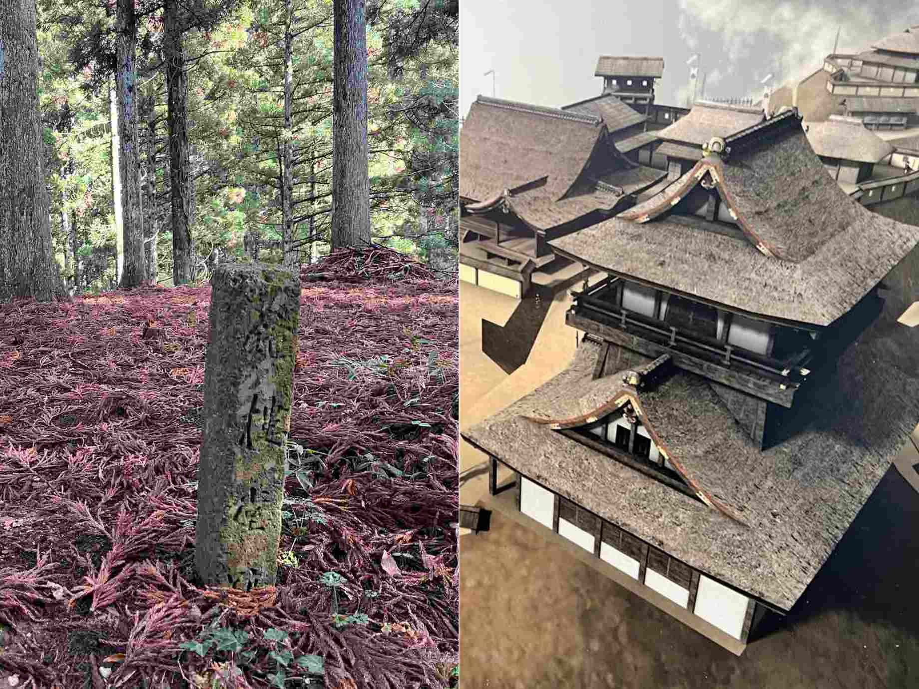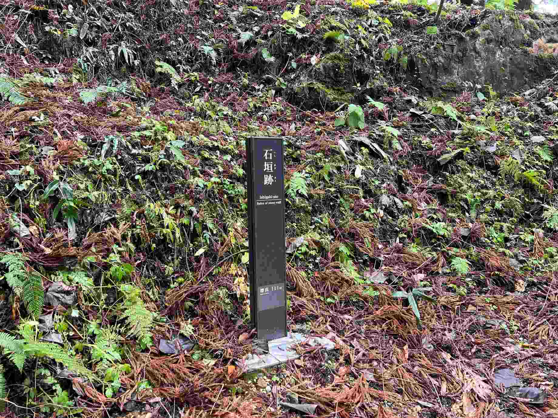 二の丸へ向かう途中、城で唯一の石垣が姿を現す。鏡石※として築かれたのだろうか、来訪者に威厳を示すための象徴的な石である。