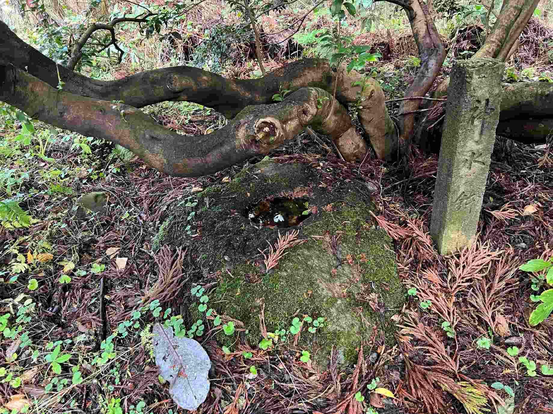 二の丸には「神水鉢」と名付けられた石造物があり、庭園の手水鉢のような姿をしているが、中央に穴が開いており、旗を立てていたと伝わる。 |