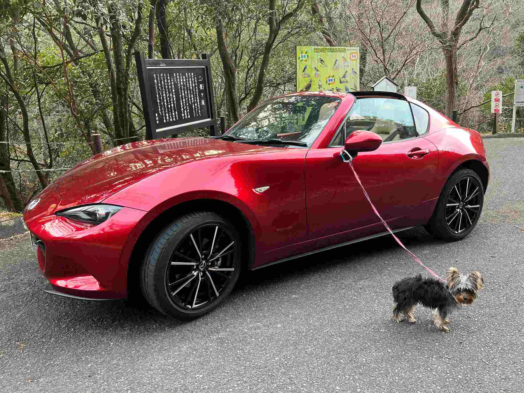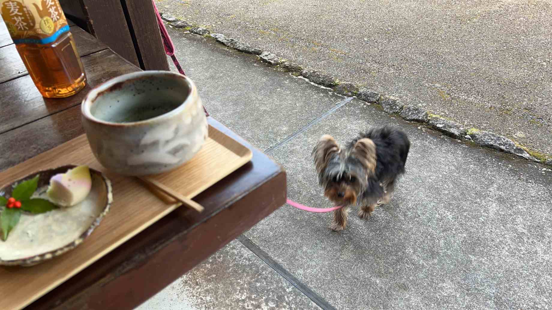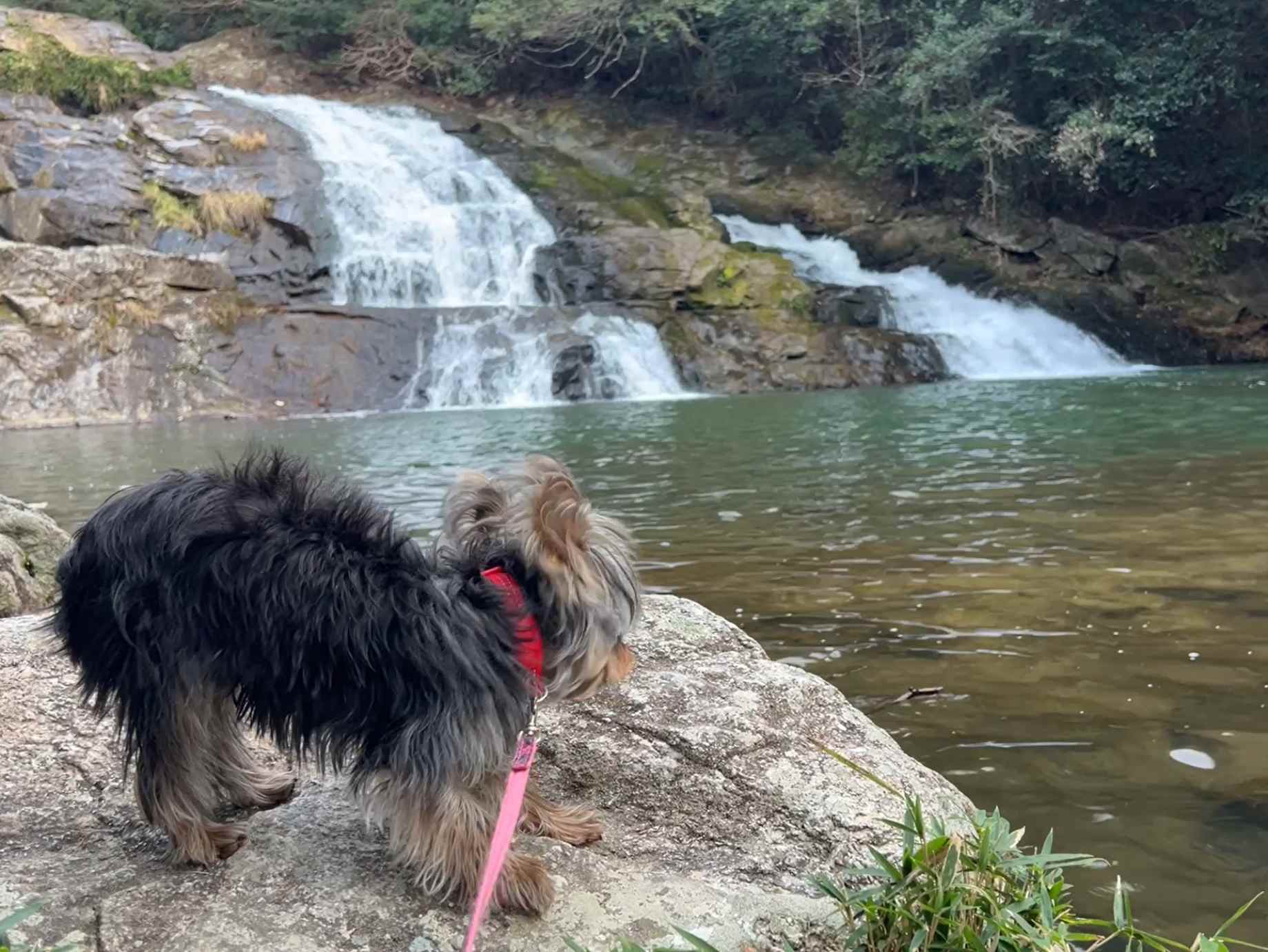 元気いっぱいの愛犬に引かれるようにして滝つぼへ向かう。 |