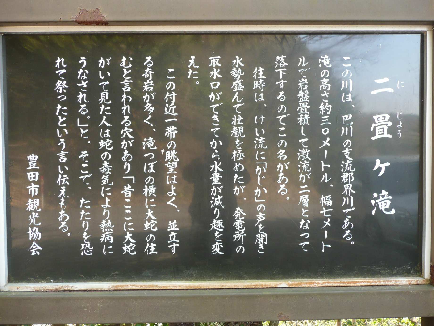 | 二畳ヶ滝(ニジョウガタキ) | 落差30m | 時間1分 | 評価6 |