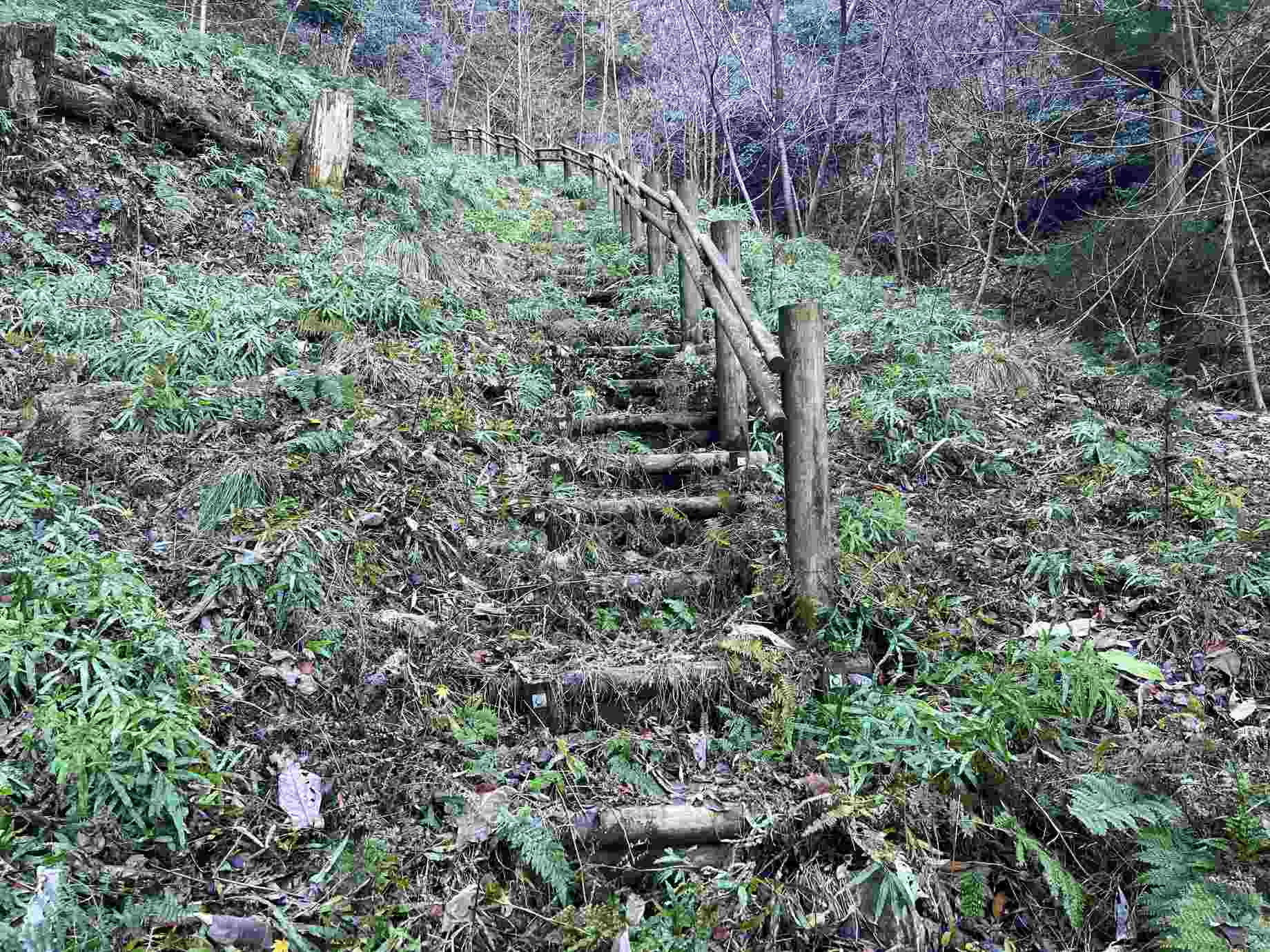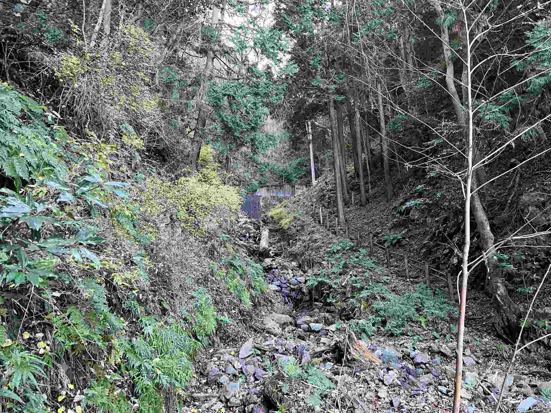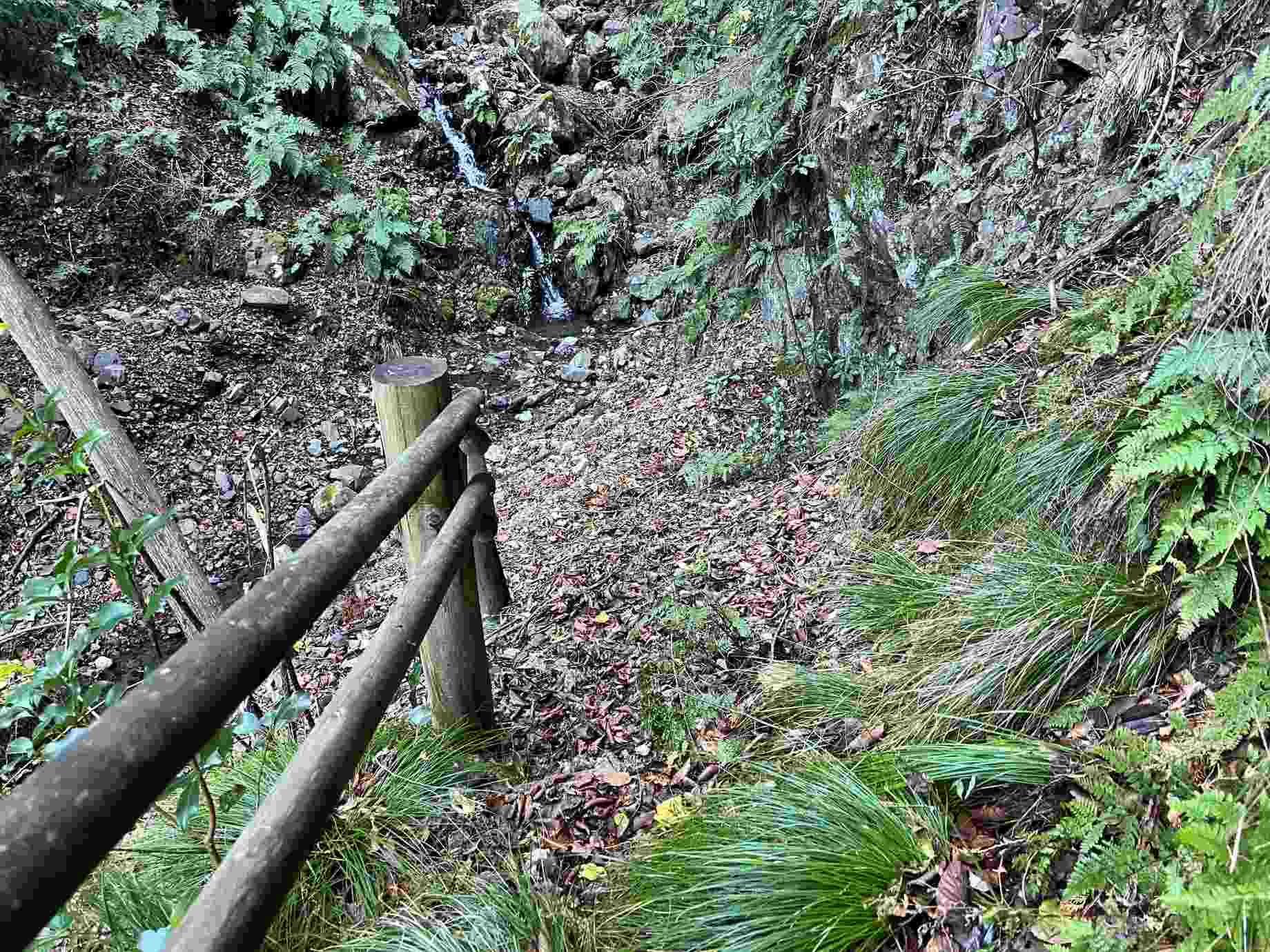 さらに進むと赤岩奥の院の手前に滝への入口があった。 |
