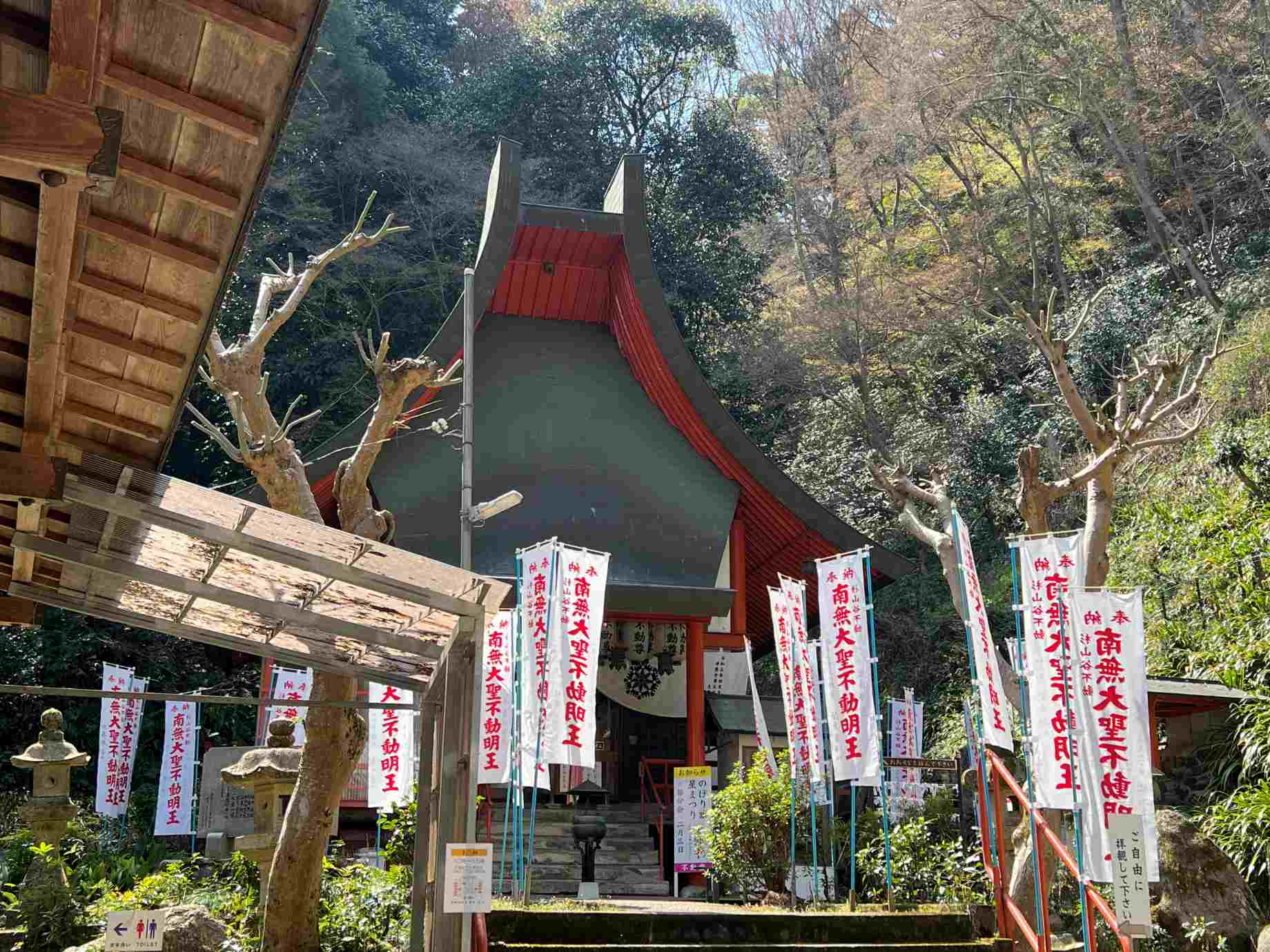 階段を降りると鳥居と南無大聖不動明王の幟が立ったていた。 |