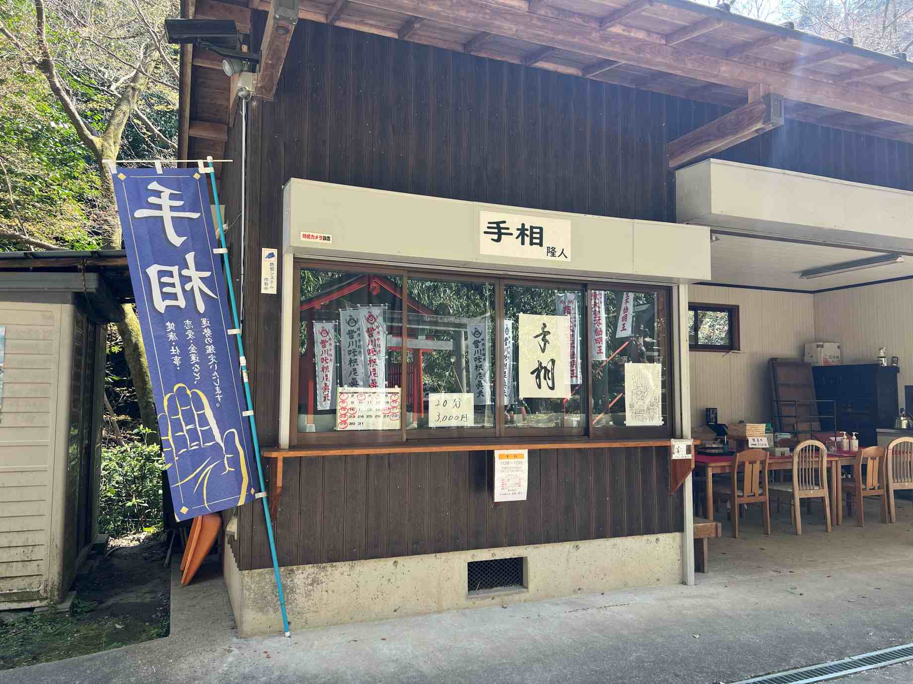 杉山谷不動堂の隣には手相の案内があった。神聖な場所だけにあたりそうな雰囲気が漂っている。 |