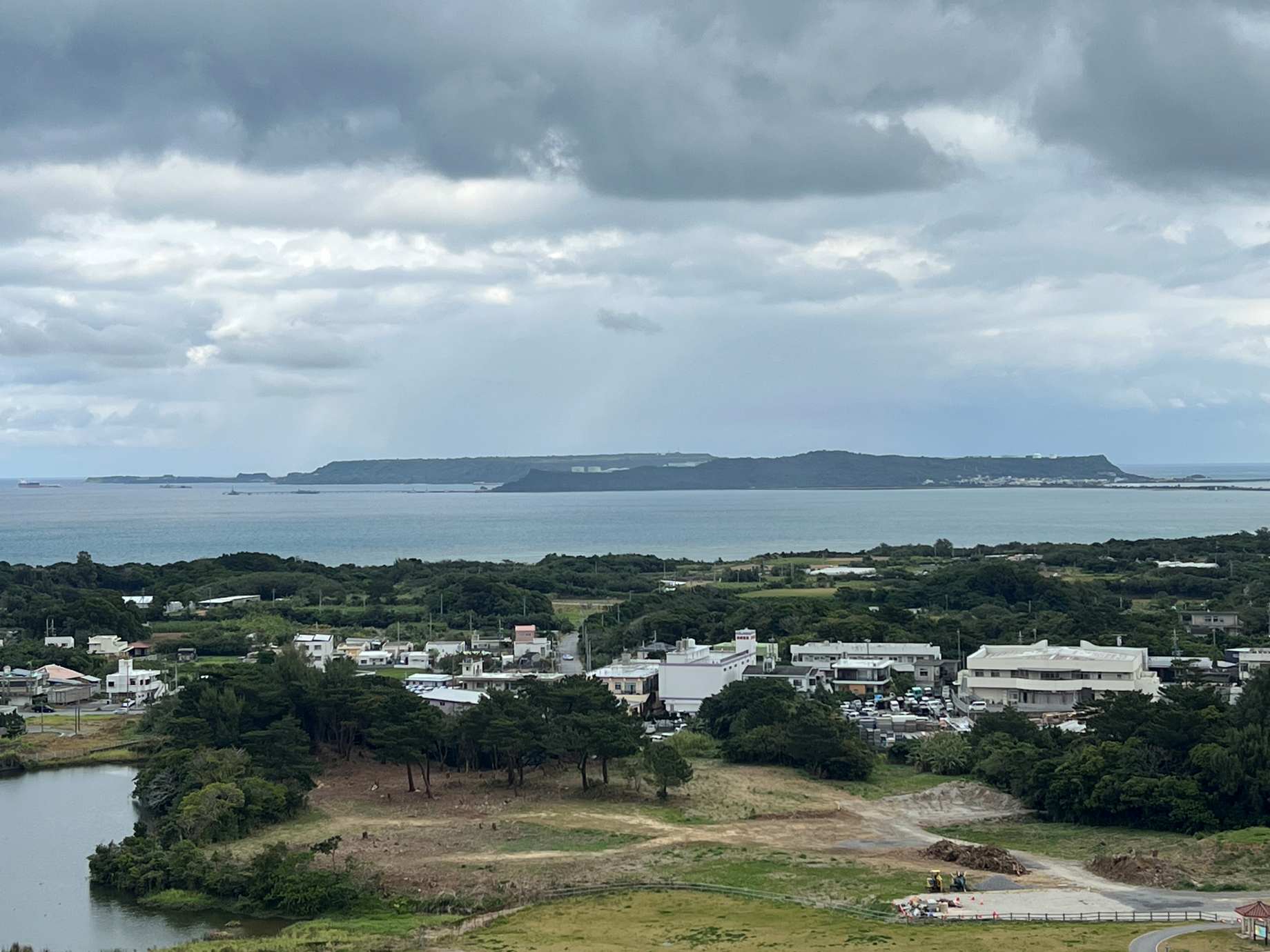 展望台からは朝の通勤渋滞だろうか、沖縄自動車道上で停まるライトの列が見えた。 |