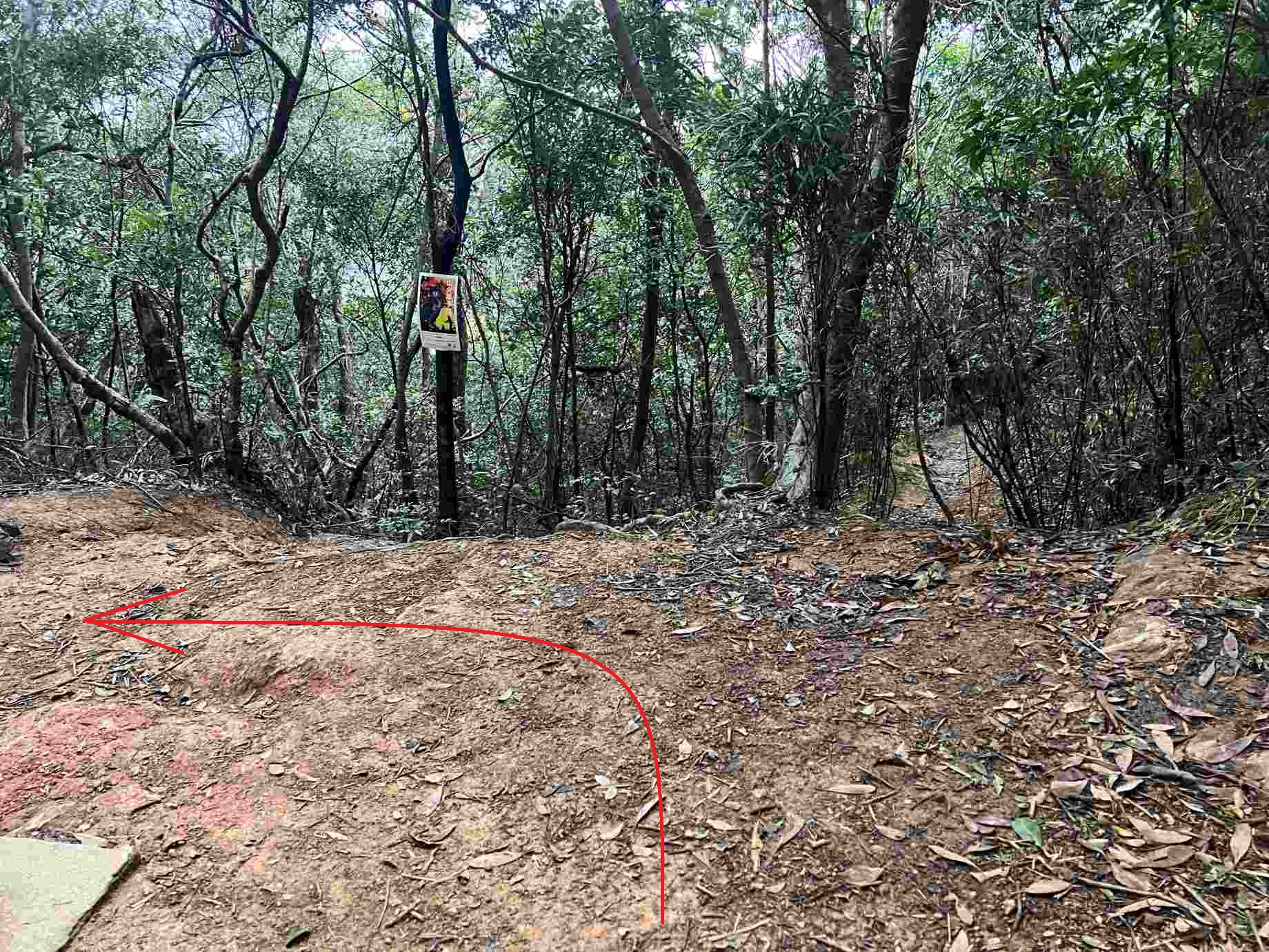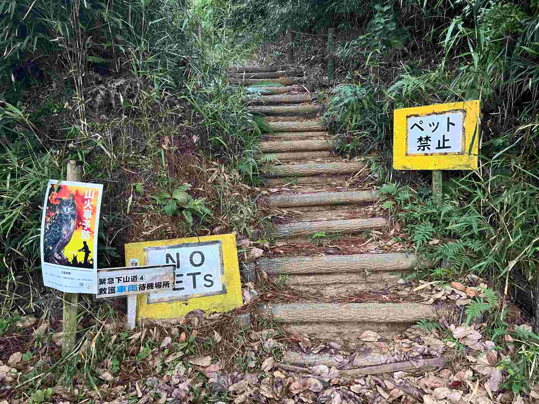 しばらく峠道を歩いていると緊急下山道に変わるので、ここを右へ曲がって、急坂を降りて行く。 |