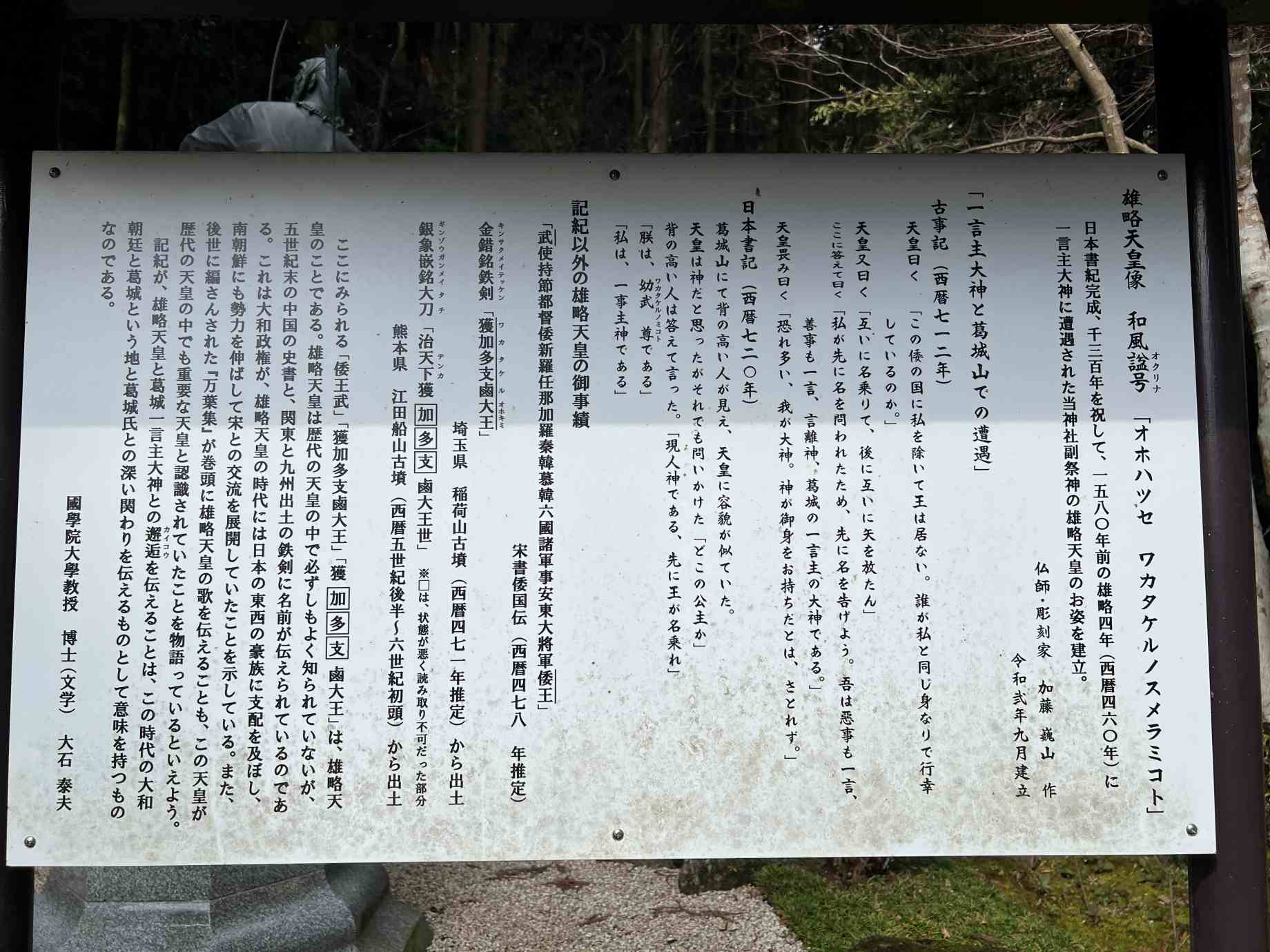 但し、古事記では一言主が先に名乗り、日本書紀では後に名乗っており、天皇と葛城氏(一言主)の力関係の変化を反映しているという。 |