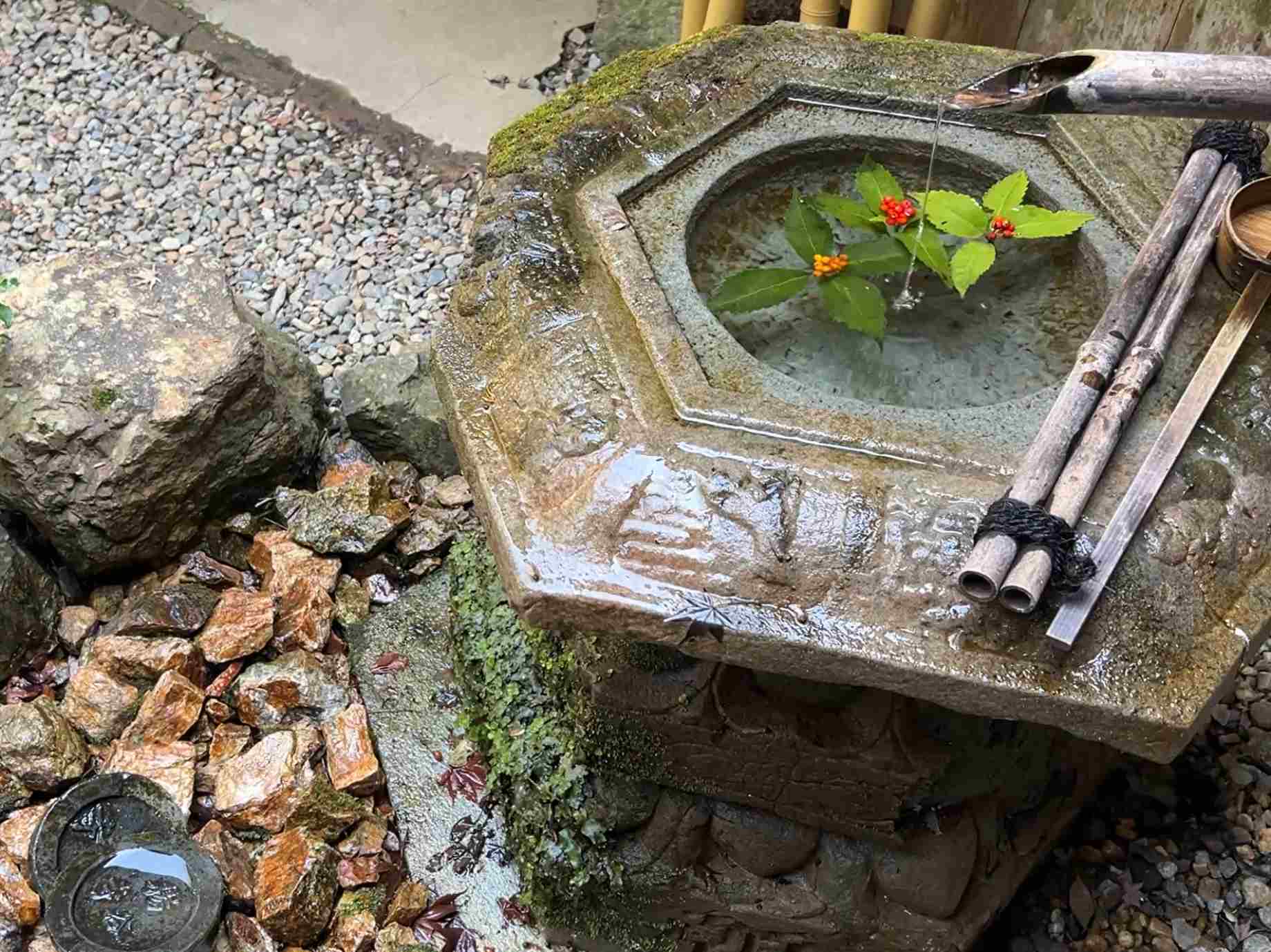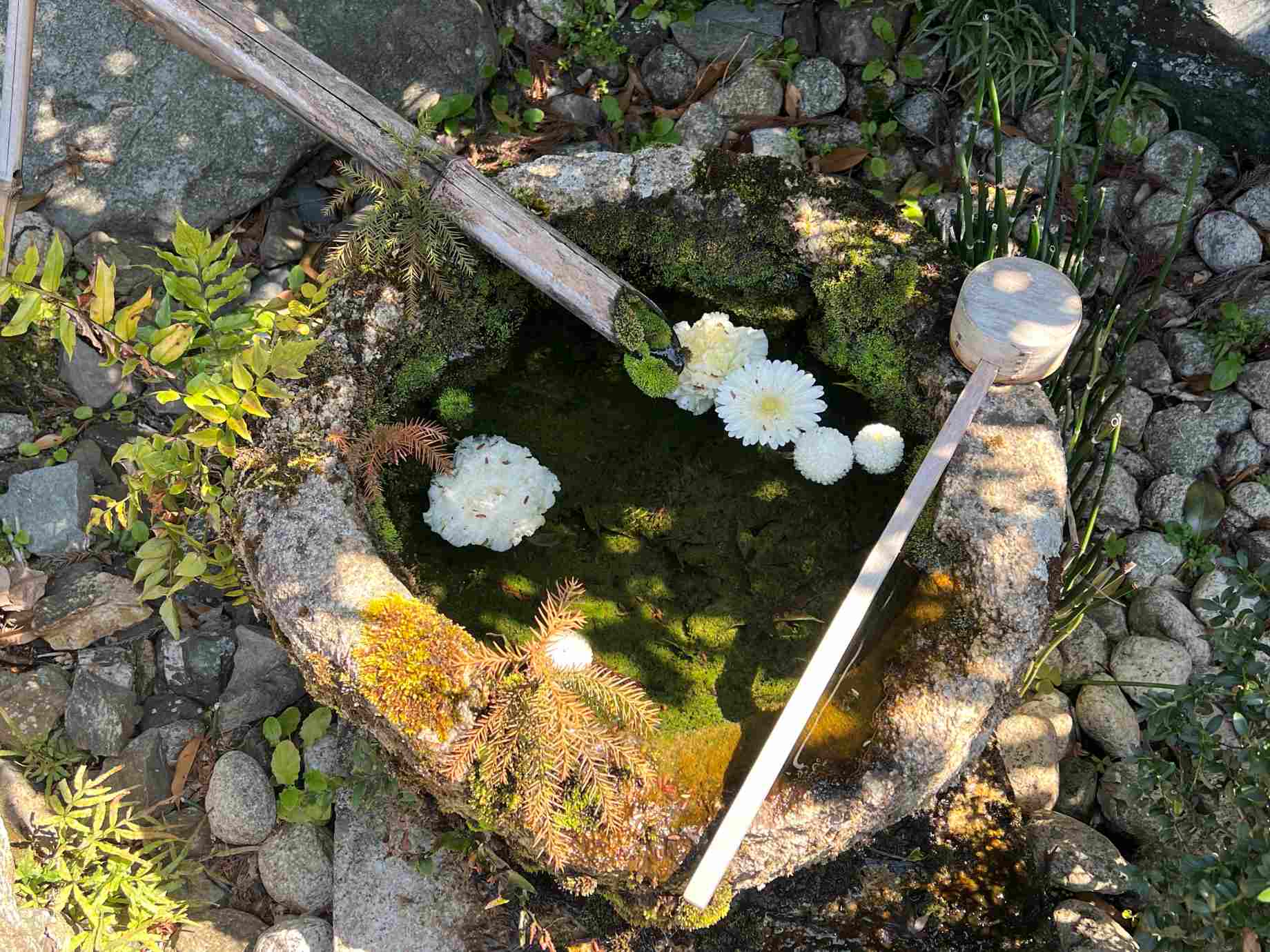 こちらは水琴窟。手水鉢の近くに設けられた地中の空洞の中に水滴を落下させ、その際に発せられる音を反響させる仕掛けで、手水鉢の排水を処理する機能も持つ。 |